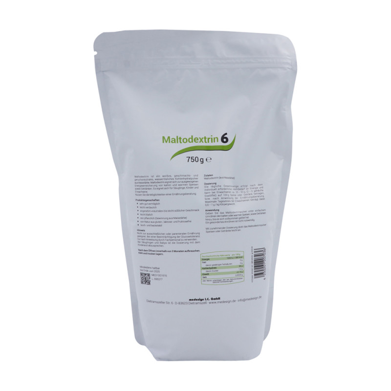 medesign Maltodextrin ist ein geschmacksneutrales Kohlenhydratpulver, welches zur Kalorien-anreicherung in Getränke und Speisen gemischt wird. Maltodextrin wird vom Körper langsamer resorbiert als beispielsweise Traubenzucker und führt deshalb zu einem geringeren Anstieg des Blutzuckerspiegels.