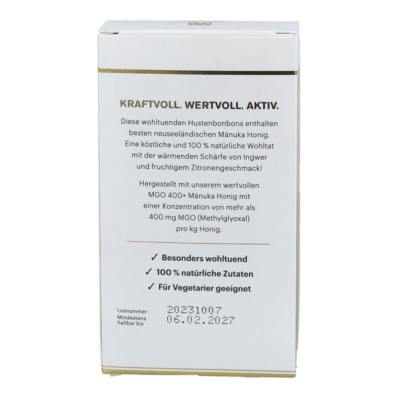 Ob als Begleiter im Winter oder zur täglichen Unterstützung des Wohlbefindens, die Mānuka Honig Hustenbonbons Ingwer-Zitrone sind eine Wohltat aus 100% natürlichen Zutaten. Der enthaltene Mānuka Honig hat einen MGO Gehalt von mindestens 400mg Methylglyoxal pro kg Honig.