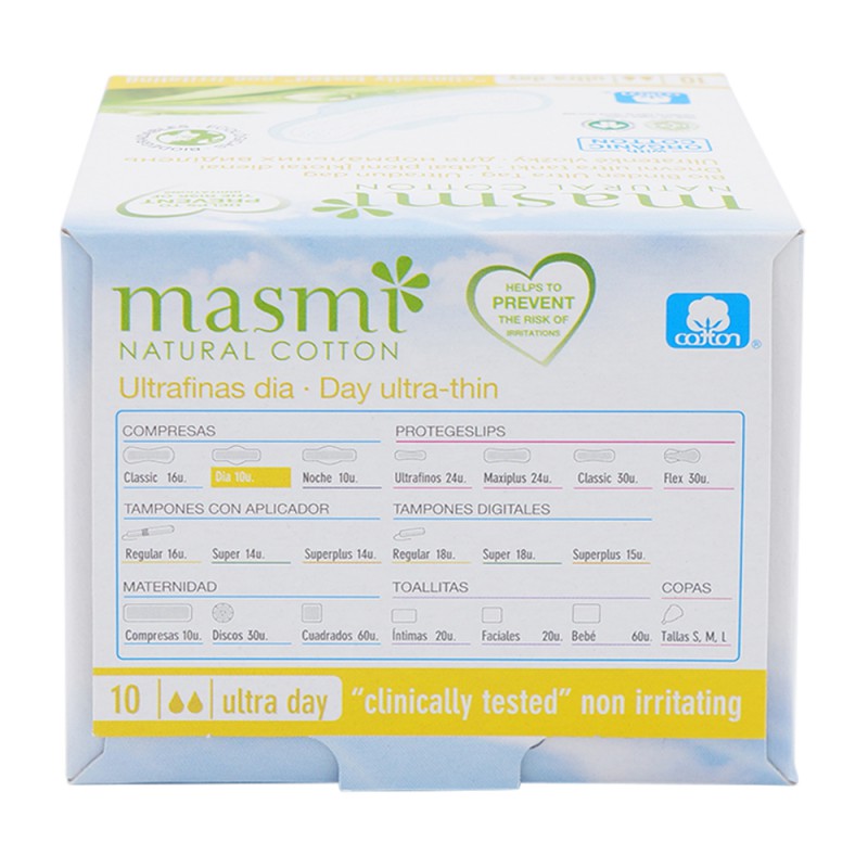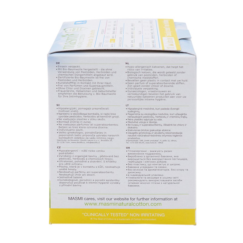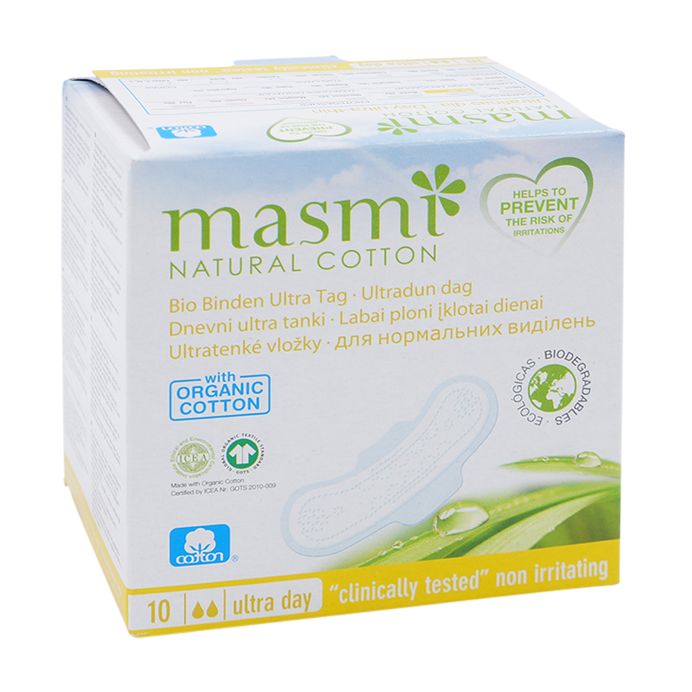 Masmi BIO Binden Ultra aus 100% Bio-Baumwolle –Baumwolle ist atmungsaktiv und leitet die Flüssigkeit wirksam ins Innere, garantiert ein optimales Feuchtigkeitsmilieu, welches den Wasserentzug reduziert und das natürliche Säure-Gleichgewicht der Schleimhaut nicht beeinflusst