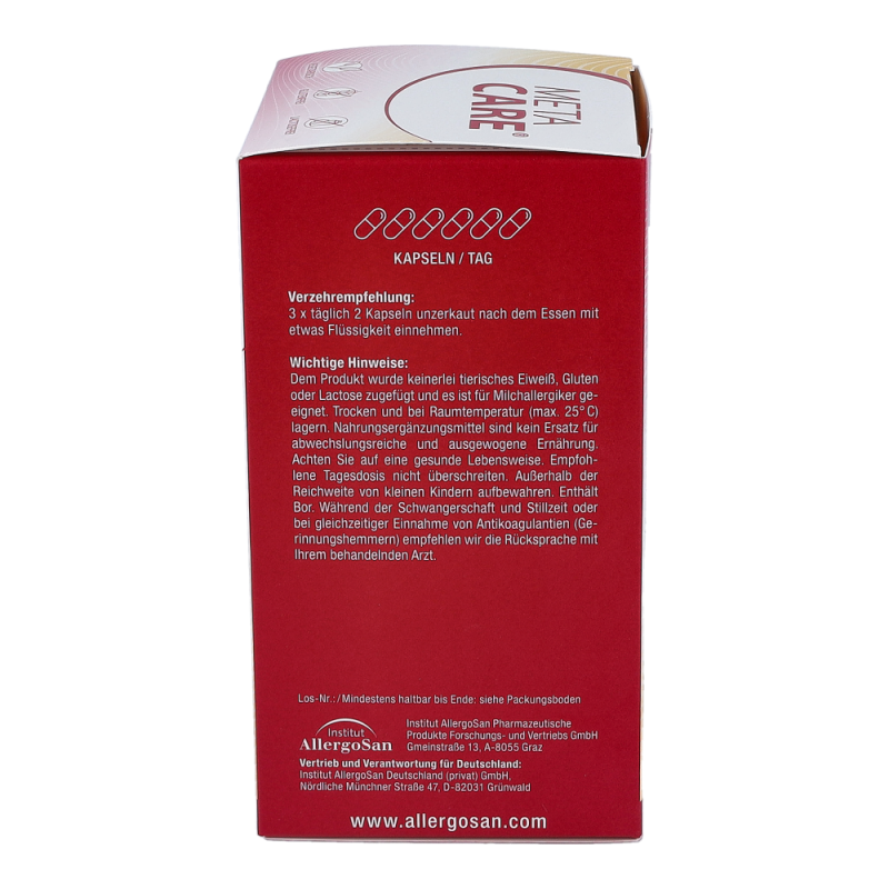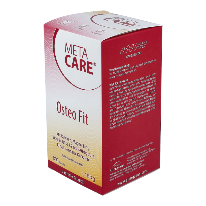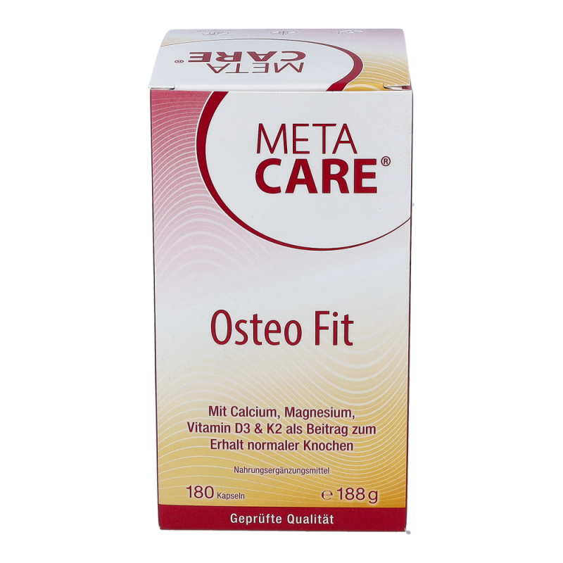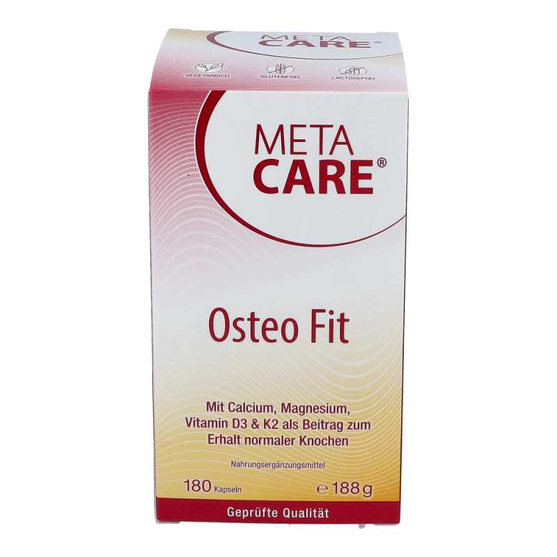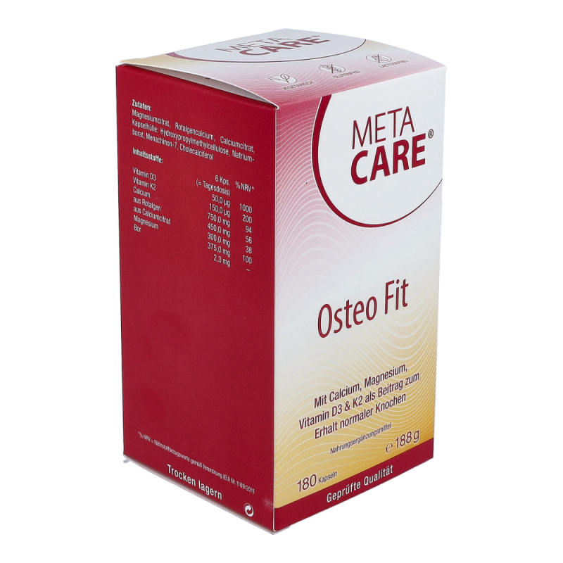 META-CARE® Osteo Fit bietet eine umfassende Kombination aus den wichtigen Knochen-Nährstoffen Calcium, Magnesium, Vitamin D3 & K2, ergänzt durch Bor. Die Mineralstoffe Calcium und Magnesium tragen wesentlich zum Erhalt normaler Knochen und Zähne bei. Ein erhöhter Bedarf kann im Wachstum, durch die Einnahme bestimmter Arzneimittel oder bei intensiver körperlicher Belastung entstehen.META-CARE® Osteo Fit enthält pflanzliches Calcium aus der Rotalge (Lithothamnium Calcareum) und Magnesium in der gut aufnehmbaren Citrat-Verbindung. Vitamin D ist entscheidend an der Aufnahme und Verwertung von Calcium beteiligt. Zusätzlich spielt das Vitamin D, zusammen mit Vitamin K, eine wichtige Rolle zum Erhalt der Knochen. Vitamin D wird zwar mit Hilfe des Sonnenlichts in der Haut gebildet, allerdings kann der Bedarf in unseren Breitengraden durch Eigensynthese oder die Ernährung meist nicht ausreichend gedeckt werden.