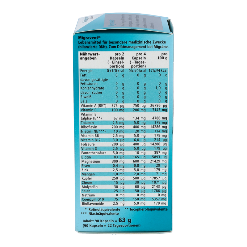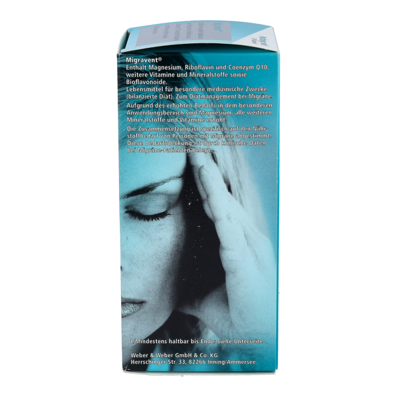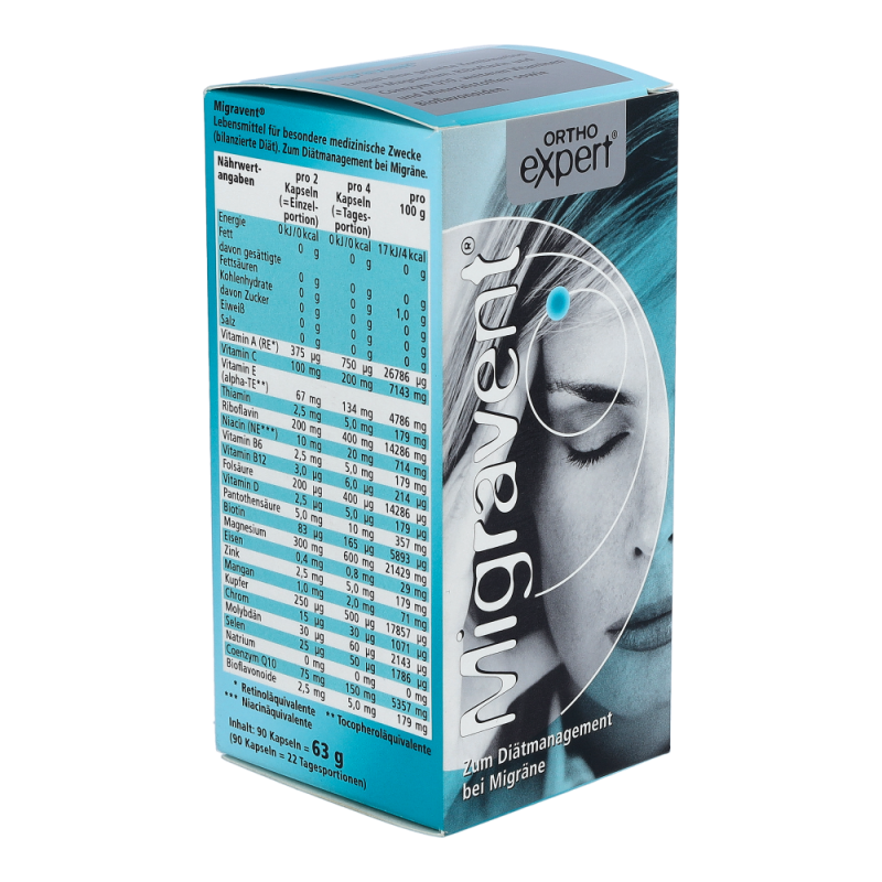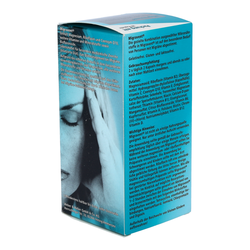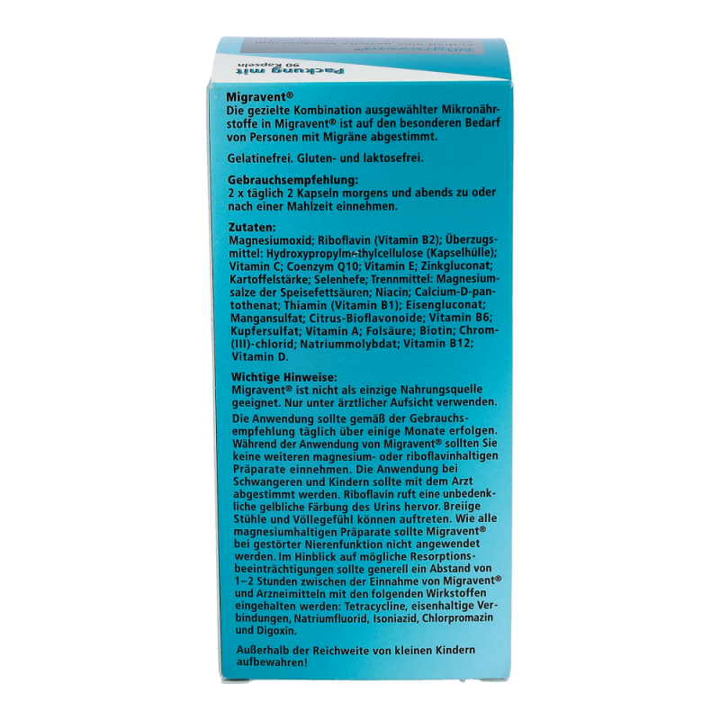 Migravent Kapseln ist ein Nahrungsergänzungsmittel zum Diätmanagement bei Migräne. Die Kapseln enthalten hochdosiert Coenzym Q10, Magnesium und Riboflavin (Vitamin B2), sind sehr gut verträglich und mit jeder Akuttherapie kombinierbar..