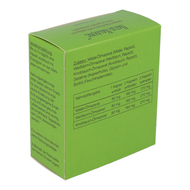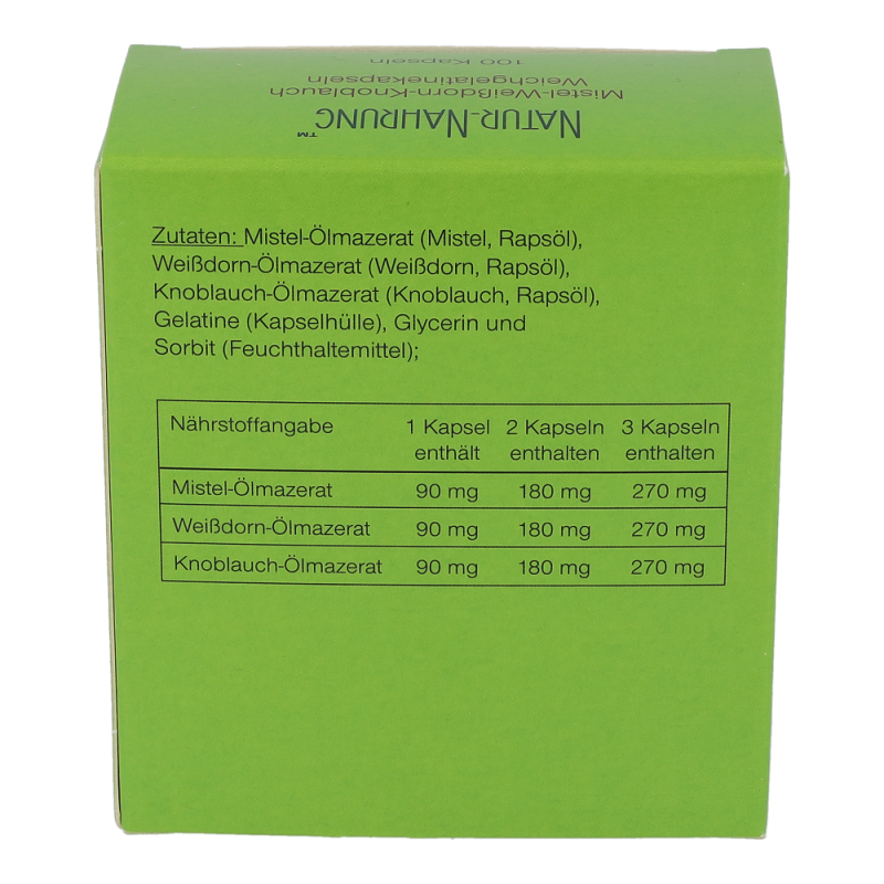 Die pflanzlichen Wirkstoffe von Naturnahrung Mistel-Weißdorn-Knoblauch Kapseln verbessern die Leistungsfähigkeit des Herzens, in dem sie die Gefäße erweitern und für eine bessere Durchblutung des Herzmuskels und der Herzkranzgefäße sorgen.Ein gesundes Herz-Kreislauf-System ist wichtig für körperliche und geistliche Fitness, Vitalität und Leistungsfähigkeit. Die pflanzliche Wirkstoff-Kombination in Naturnahrung Mistel-Weißdorn-Knoblauch Kapseln sorgt für einen Dreifachschutz für Herz und Kreislauf. Knoblauch wurde schon vor Jahrtausenden in zahlreichen Kulturen als Medizin verwendet. Heute macht man sich die cholesterinsenkende Eigenschaft des Knoblauchs zu nutze, um Bluthochdruck zu normalisieren, die Fließfähigkeit des Blutes zu verbessern und das Immunsystem zu stärken. Knoblauch soll zudem gegen Krebs schützen. Die Mistel gehört zu den ältesten Heilpflanzen der Menschheit. Sie stimuliert das Immunsystem, unterstützt die Herz-Kreislauf-Funktion und fördert die körperliche und geistige Leistungsfähigkeit. Auch in der Krebstherapie hat die Mistel eine lange Tradition, die auf Rudolf Steiner zurückgeht. So gehörte die Heilpflanze in der anthroposophischen Medizin zum Kernstück der Krebstherapie. Die heilende Wirkung des Weißdorns ist inzwischen in zahlreichen Untersuchungen belegt. Vor allem bei Herzschwäche und verlangsamter Herztätigkeit ist Weißdorn bestens wirksam und gut verträglich. Weißdorn fördert die Herzleistung und verbessert das Schlagvolumen des Herzens. Die Koronargefäße erweitern sich und der Herzmuskel kann besser mit Sauerstoff versorgt werden. .