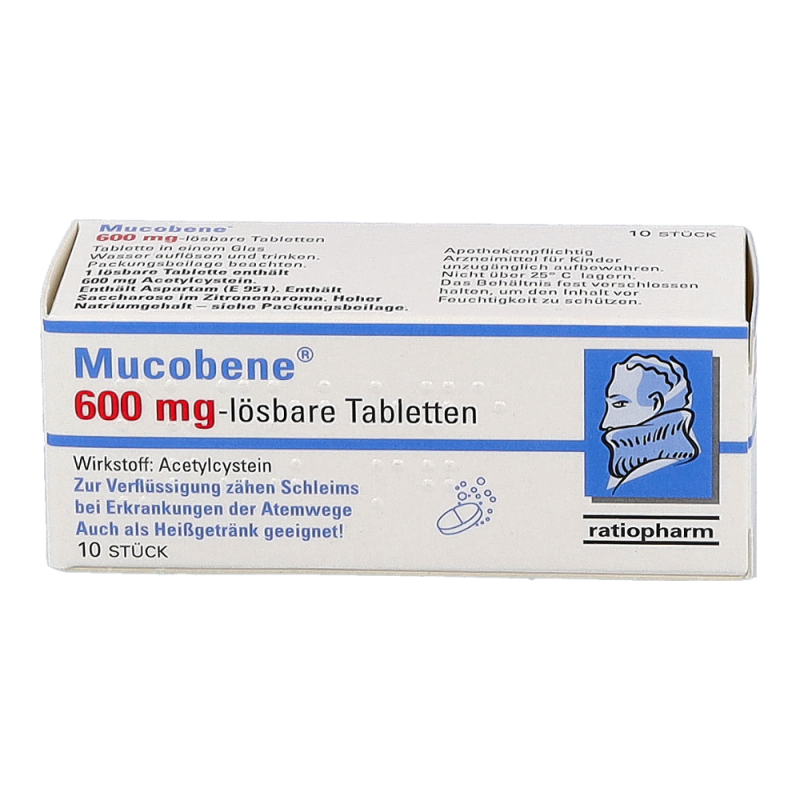 Mucobene 600 mg lösbare Tabletten eignen sich als Zusatztherapie zusammen mit reichlich Flüssigkeit, zur Schleimlösung und zum erleichterten Abhusten bei Atemwegserkrankungen (Lunge und Bronchien).