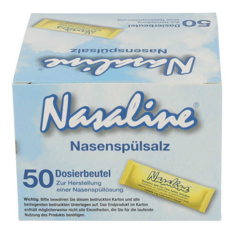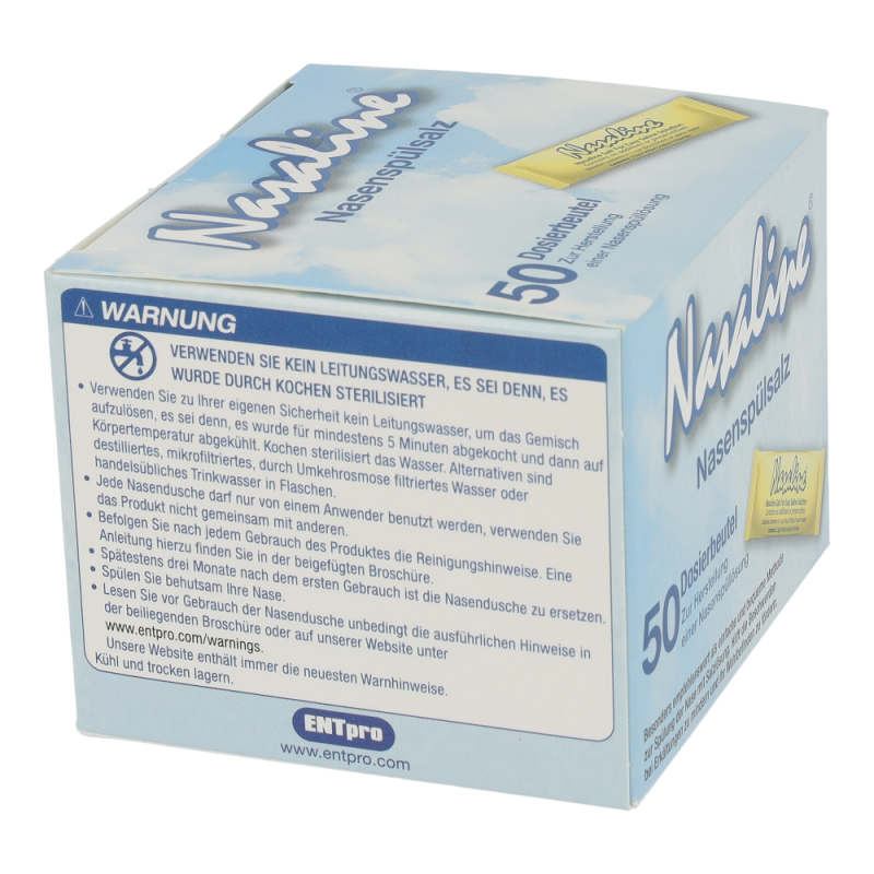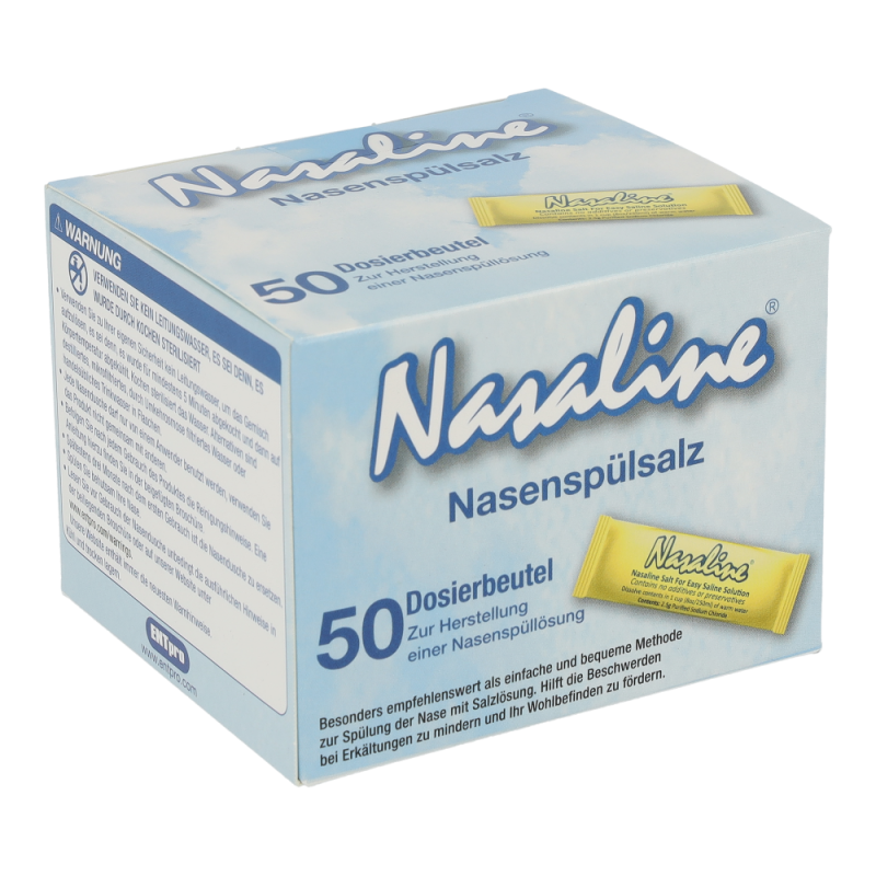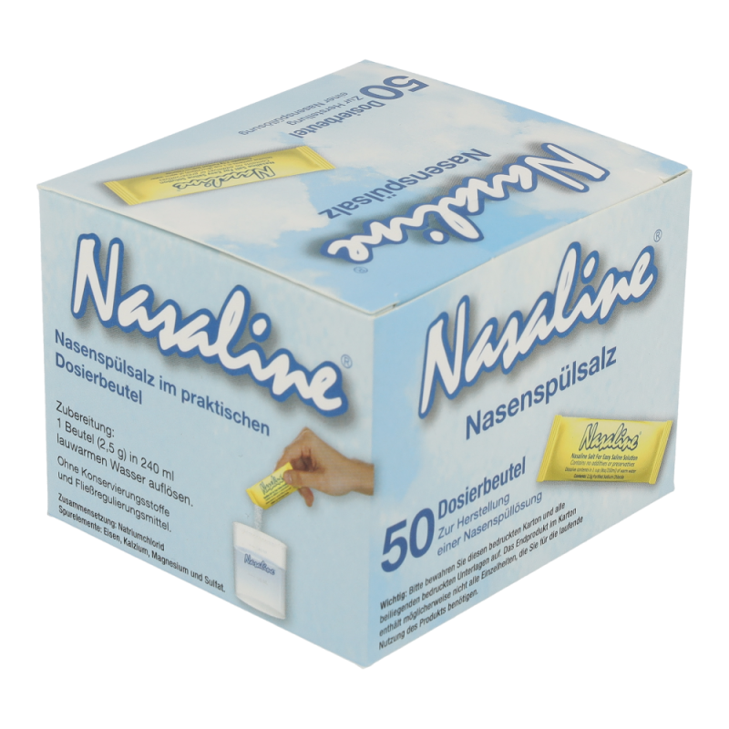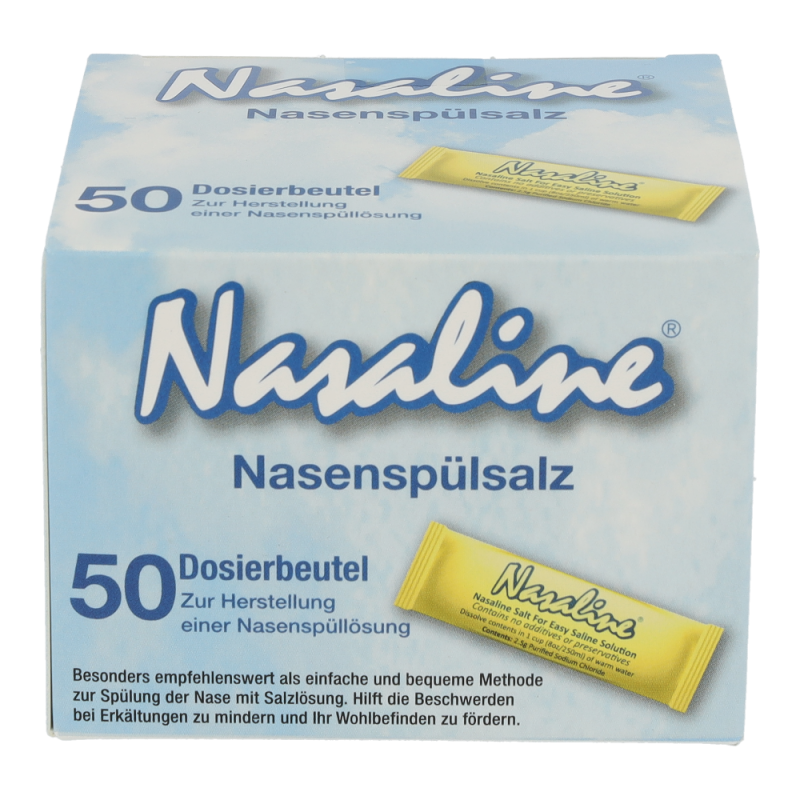 Erwärmen Sie 250ml reines, trinkbares Leitungswasser auf Körperwärme und lösen Sie einen Beutel NASALINE-Salz (ca. 2.5g) darin auf. So erhalten Sie eine isotonische Kochsalzlösung. NASALINE-Salz ist jodfrei. Ziehen Sie das körperwarme Salzwasser in die Spritze, indem Sie den Spritzenkolben hochziehen. Stellen oder setzen Sie sich leicht vorgebeugt über ein Waschbecken, drücken den Silikon-Top dicht gegen das Nasenloch und spritzen Sie das Salzwasser langsam in die Nase. Während des Spülvorgangs atmen Sie ruhig durch den Mund und vermeiden Sie zu schlucken. Das Salzwasser läuft durch das zweite Nasenloch ab, wobei überflüssiger Schleim und Fremdpartikel aus der Nase entfernt werden. Eine Spülung dauert zwischen drei und sieben Sekunden. Spülen Sie anschließend das zweite Nasenloch auf gleiche Weise. Achtung: Wenn Sie von Ohrenentzündungen oder andere Ohrenbeschwerden betroffen sind, sollten Sie vor der Anwendung von NASALINE einen Arzt konsultieren. Spülen Sie die Nase nicht, wenn sie völlig verstopft ist oder falls Sie einen Druck in den Ohren verspüren. Zu Risiken und Nebenwirkungen befragen Sie bitte Ihren Arzt oder Apotheker.