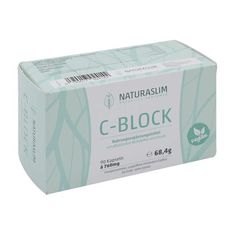 Der Naturaslim C-Block enthält unter anderem den neuartigen Wirkstoff Phaseolin, der aus der weißen Kidney-Bohne Das Phaseolin, welches nur bei mittel- und langkettigen Kohlenhydraten (Brot, Pizza, Pasta, Kartoffel, Reis, Müsli usw.) wirken kann, wird beim Naturaslim C-Block durch die Wirkung von HCA optimal ergänzt. Außerdem wurden Chrom und Vitamin C zugesetzt.