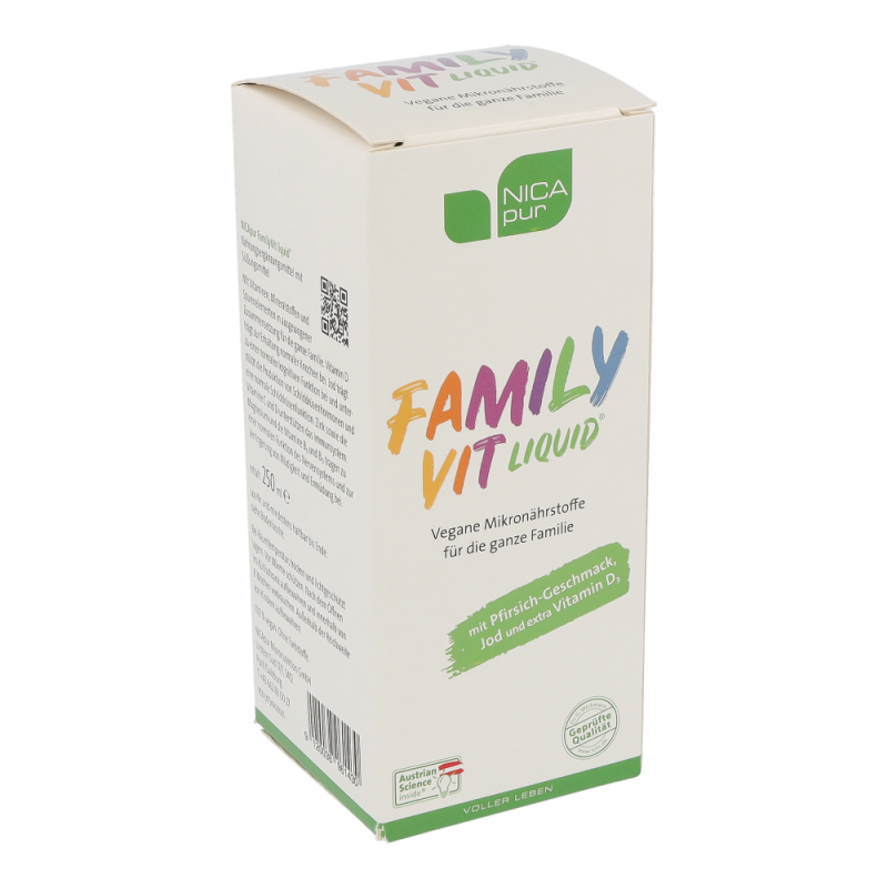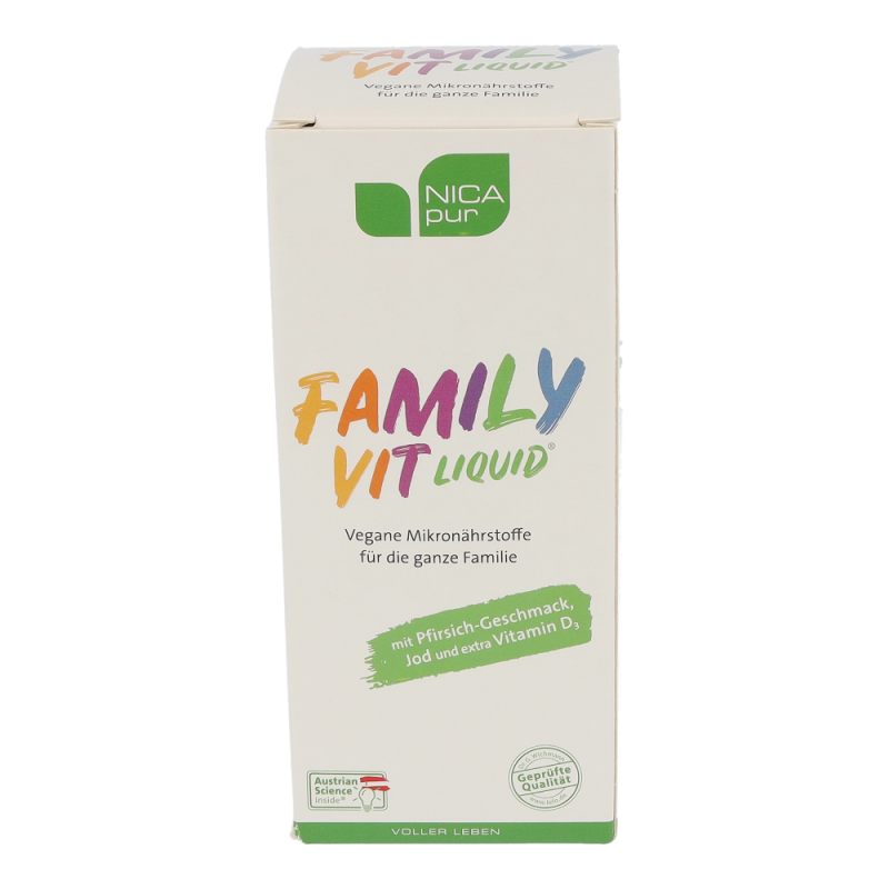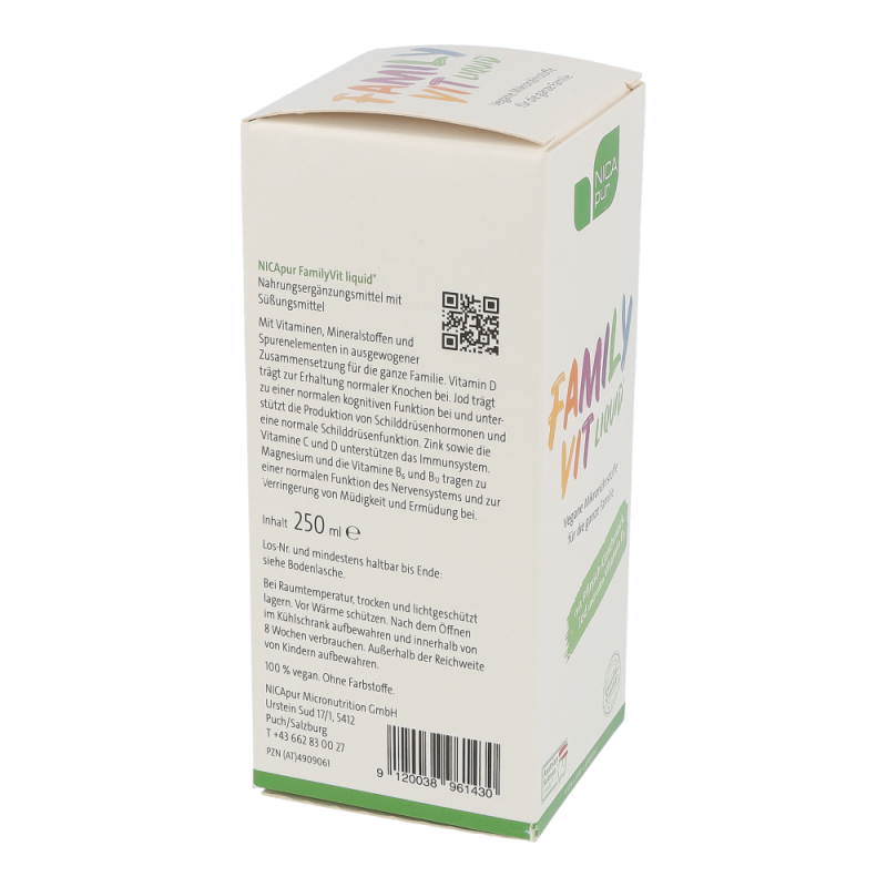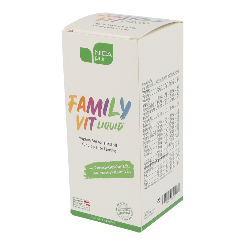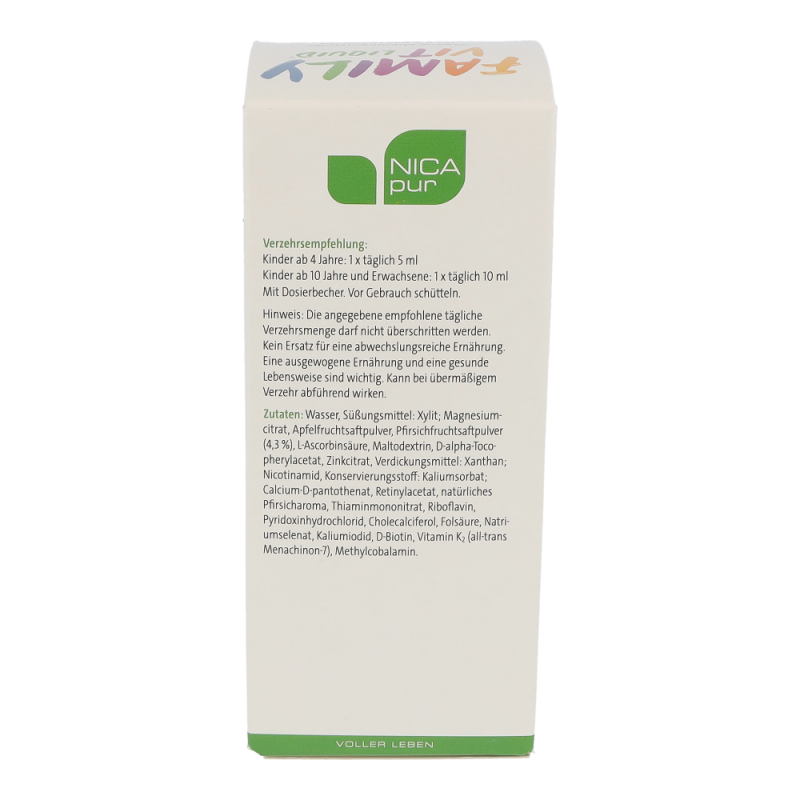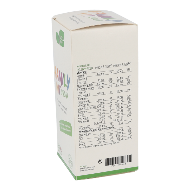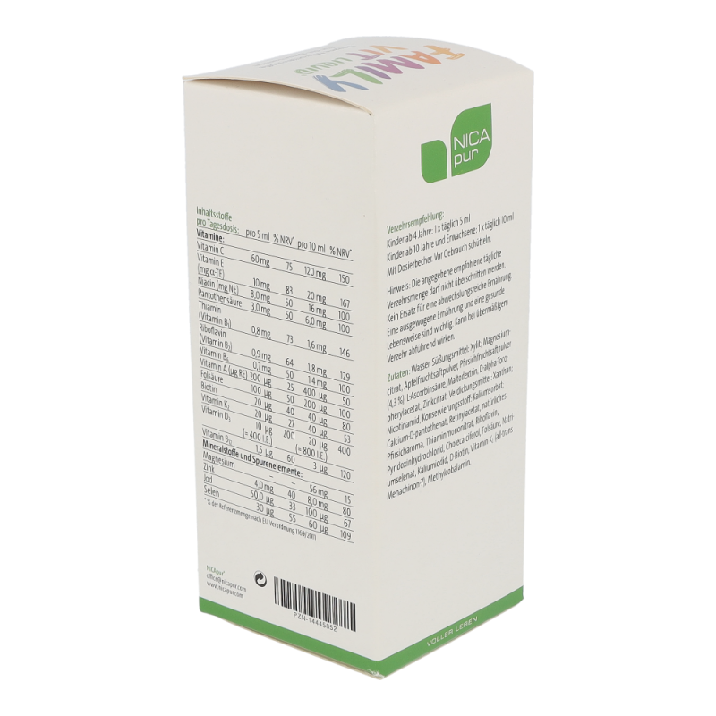 Nicapur FamilyVit liquid ist ein Nahrungsergänzungsmittel mit Süßungsmittel sowie wertvollen Vitaminen, Mineralstoffen und Spurenelementen in ausgewogener Zusammensetzung für die ganze Familie.