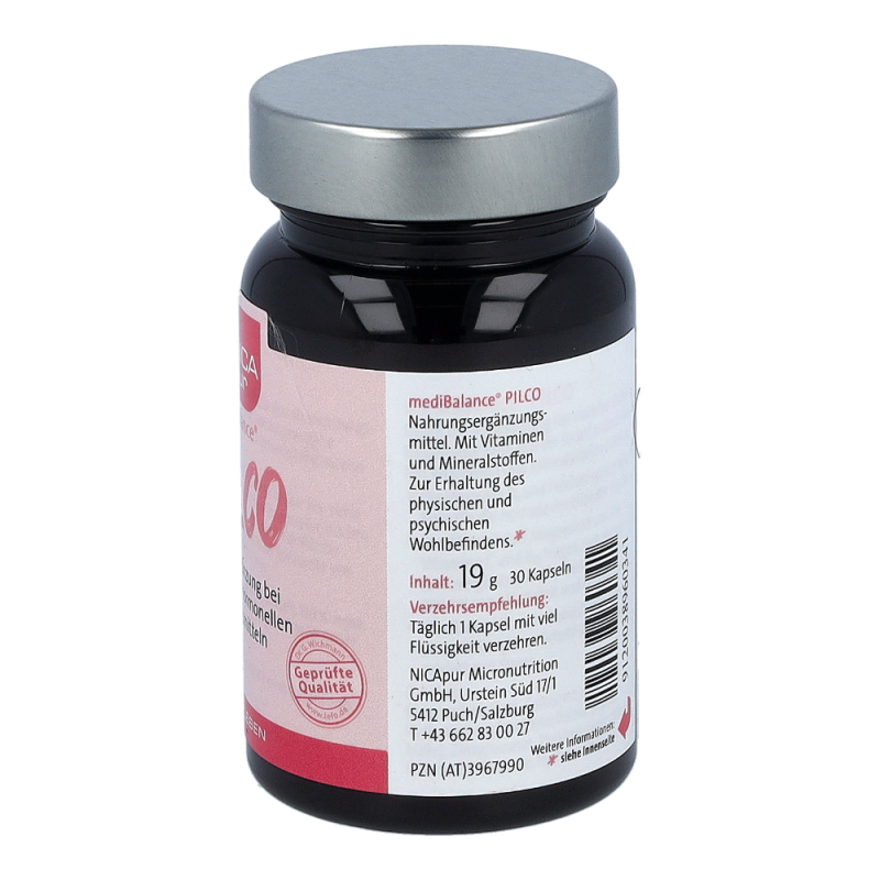 Nicapur Medibalance Pilco Kapseln ist ein maßgeschneidertes Nahrungsergänzungsmittel für Pillen-Verwenderinnen mit ausgewählten Vitaminen und Mineralstoffen, insbesondere Vitamin B6 und Folsäure. Durch die Verwendung hormoneller Verhütungsmittel („Pille“) kann der Vitamin B6- und der Folsäure-Spiegel im Körper sinken. Eine regelmäßige Ergänzung fördert die Erhaltung gesunder Vitamin B6- und Folsäure-Werte und unterstützt psychische Funktionen.