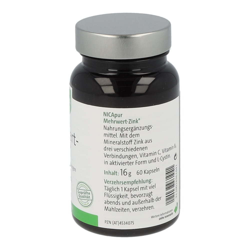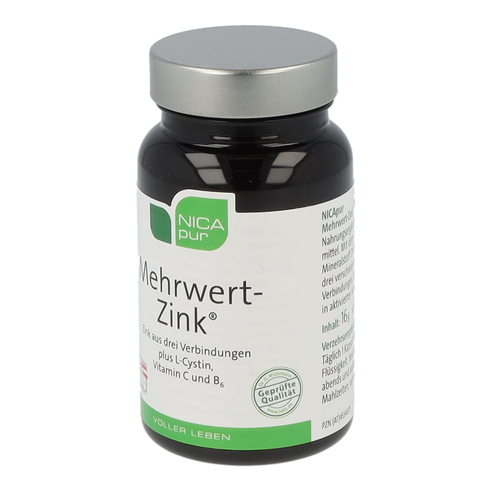 Nicapur Mehrwert-Zink ist ein Nahrungsergänzungsmittel mit dem Mineralstoff Zink aus drei verschiedenen Verbindungen, Vitamin C, Vitamin B6 in aktivierter Form und L-Cystin
