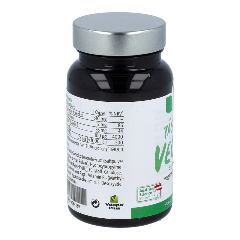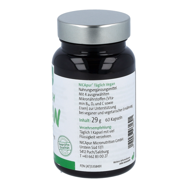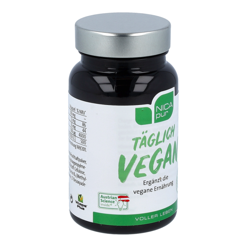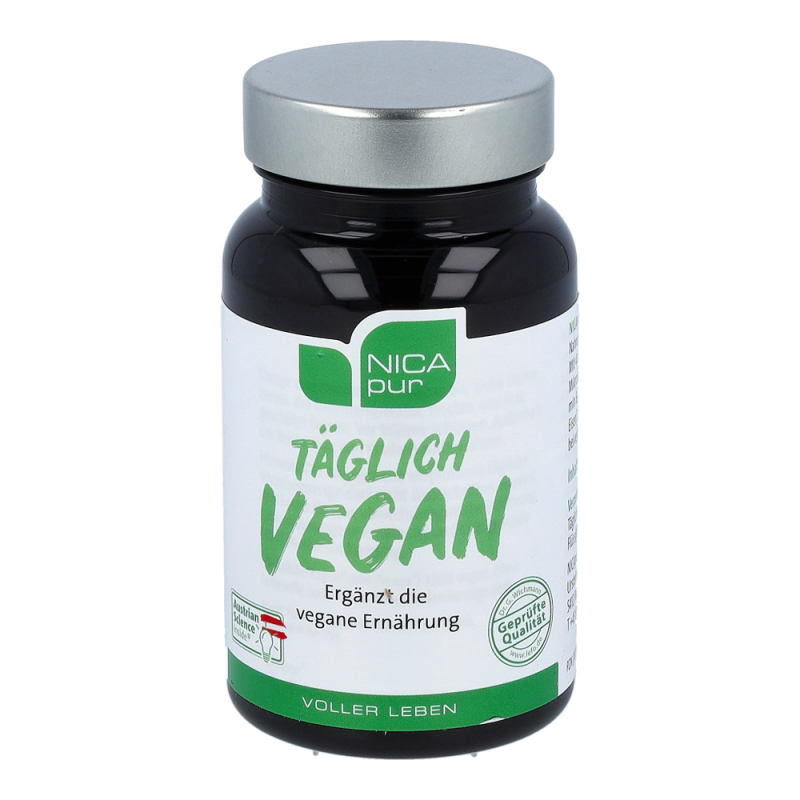 Täglich Vegan ist ein Nahrungsergänzungsmittel mit 4 ausgewählten Mirkonährstoffen zur Unterstützung bei veganer und vegetarischer Ernährung.