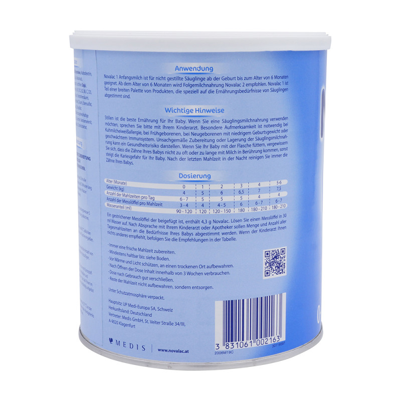 Novalac 1 ist eine Säuglingsanfangsnahrung für Babys von 0-6 Monate. Novalac 1universelle Säuglingsmilchnahrungbefriedigt alle Ernährungsansprüche eines Babys bis zum 6. Lebensmonat. Es hat eine muttermilchnahe Zusammensetzung und enthält alle Eiweiße, Fette, Kohlenhydrate, Aminosäuren, Vitamine und Mineralstoffe, die ein Baby für eine gesunde Entwicklung und ein gesundes Wachstum benötigt. Novalac 1 ist für Babys geeignet, die nicht, oder nur teilweise gestillt werden von Geburt an bis zum 6. Lebensmonat.