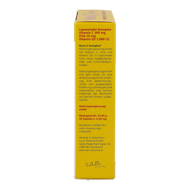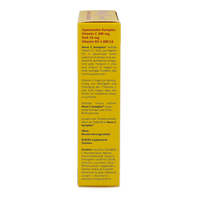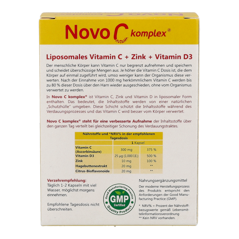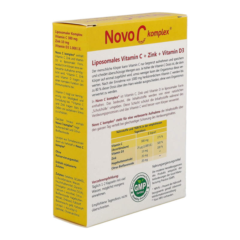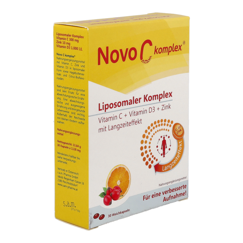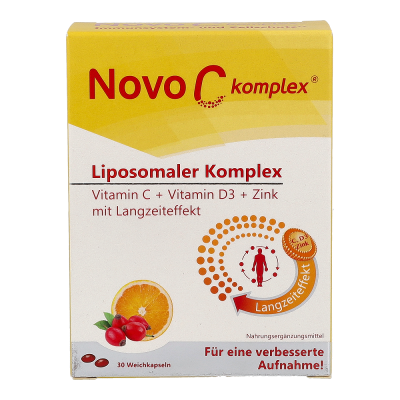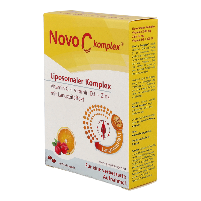 Novo C Liposomaler Vitamin C Komplex ist ein Nahrungsergänzungsmittel, der bei erhöhtem Vitamin C Bedarf Anwendung findet. Durch die liposomale Technologie ist ein gezielter Transport un deine effiziente Aufnahme des Vitamins durch den Körper möglich. Das zudem in den Kapseln enthaltene Vitamin D und Zink tragen ebenfalls zur Funktion eines normalen Immunsystems bei.