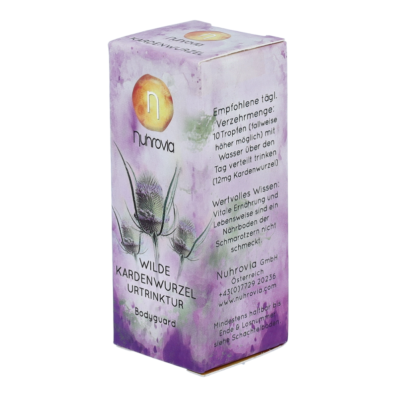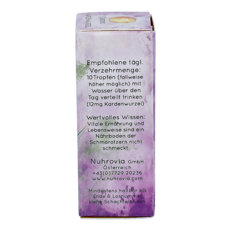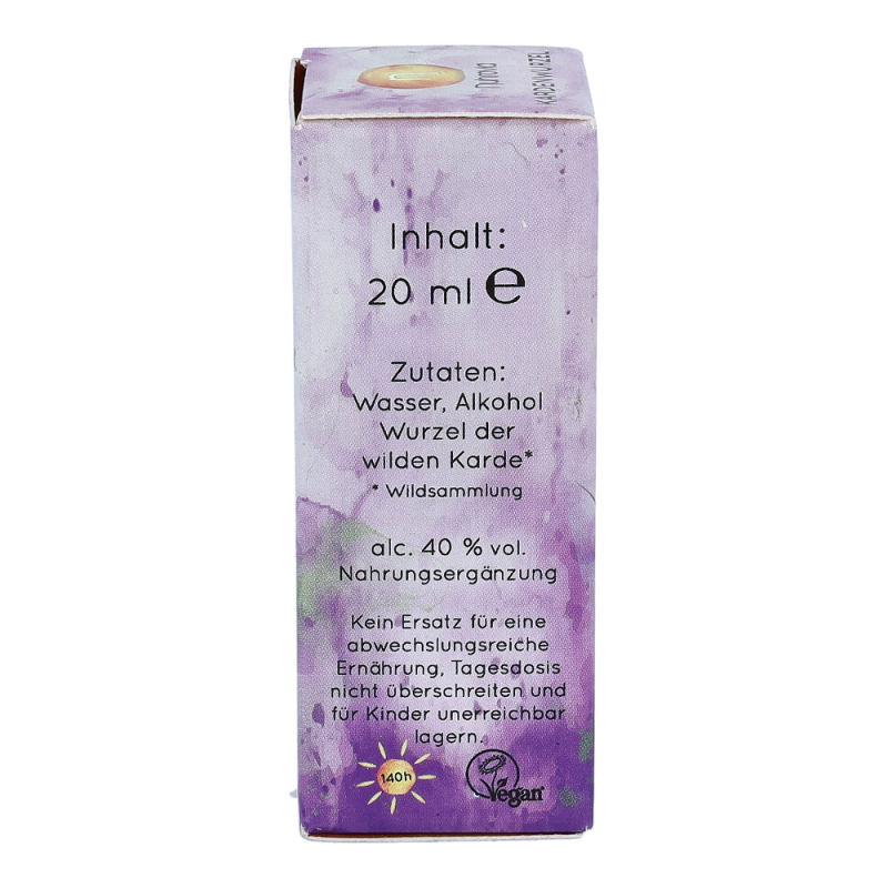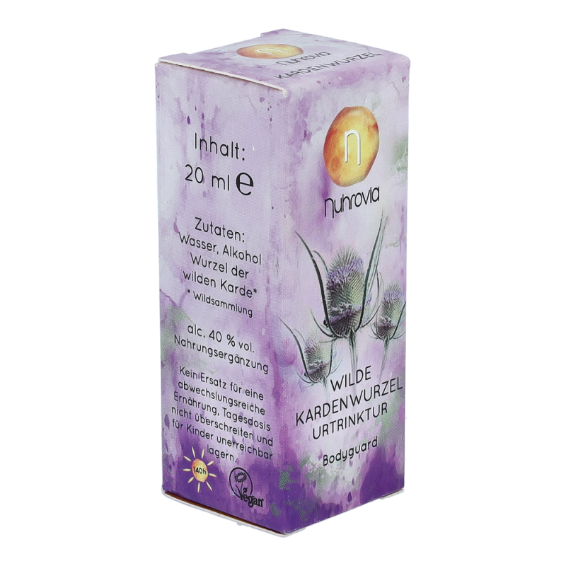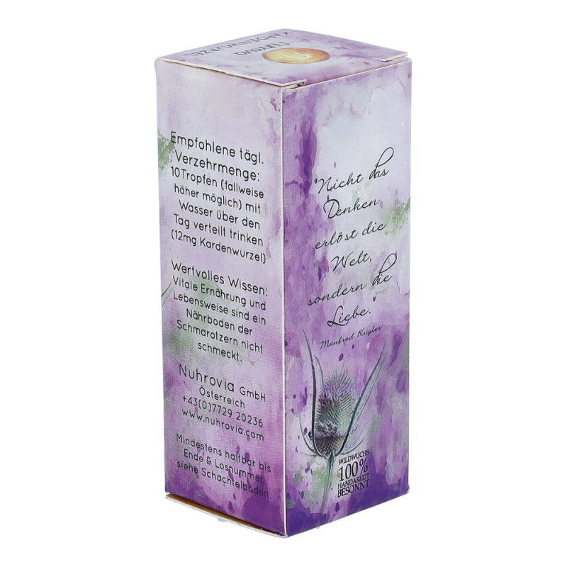 Können Sie sich schwer abgrenzen? Fühlen Sie sich leicht „übernommen“? Stress, Überforderung oder Ängste zehren?Wer psychisch am Limit ist, hat oft auch körperlich die „Türen“ offen. Die wilde Karde schützt und „würzt“ das Milieu auf eine Art, die Eindringlinge und Eroberer nicht mögen. Auch Zecken mögen keine Karde, heißt es.Naturessenzen von Nuhrovia sind reine Naturprodukte, vegan, ohne Zusatzstoffe und daher besonders gut verträglich. Sie werden in Handarbeit aus Wildpflanzen hergestellt und über mehrere Wochen im Süden mit Sonnenlicht angereichert, daher ihr Name „Sonnenhellmittel“..