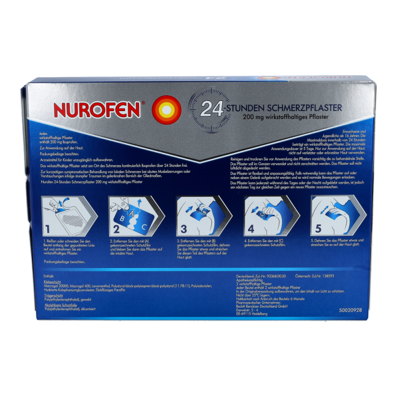 Die Nurofen 24-Stunden Schmerzpflaster mit dem Wirkstoff Ibuprofen sorgen für eine gezielte und effektive Schmerzlinderung bis zu 24 Stunden. Sie bieten eine starken Halt auch an schwierigen Stellen, wie Gelenken oder im Schulterbereich und sind dabei aber hauchdünn und ultra-flexibel. Nur eine Anwendung täglich reicht aus um den ganzen Tag schmerzfrei zu bleiben.