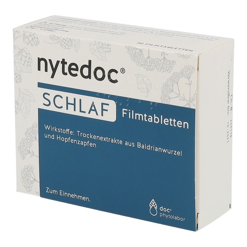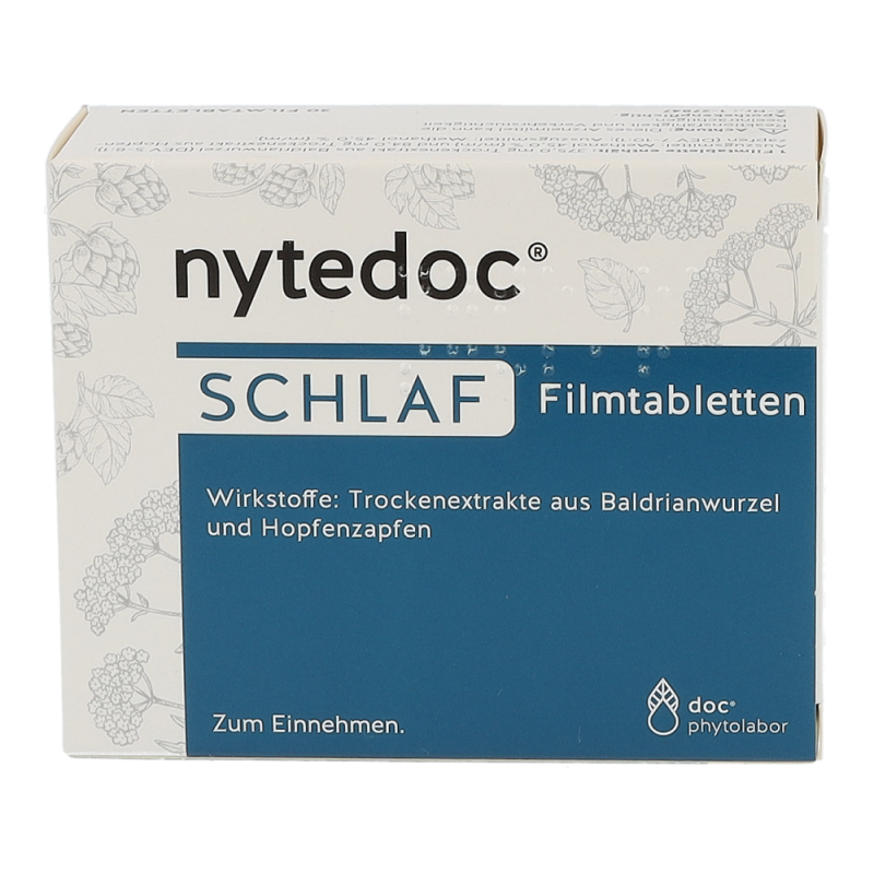 nytedoc® Schlaf ist ein pflanzliches Arzneimittel, das Trockenextrakte aus Baldrianwurzel und Hopfenzapfen kombiniert.