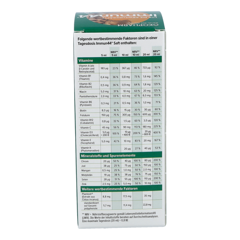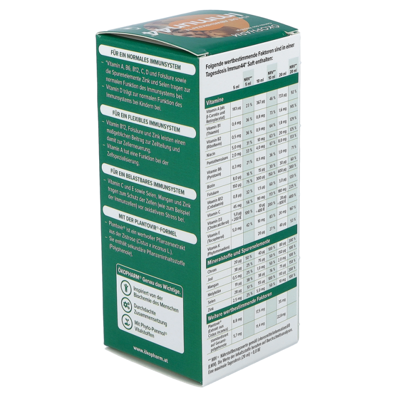- Der Immun44® Saft von ÖKOPHARM® unterstützt mit Vitamin A, B6, B12, C, D, Folsäure, Zink und Selen bereits bei Kindern ab 3 Jahren und trägt zur normalen Funktion des Immunsystems bei.