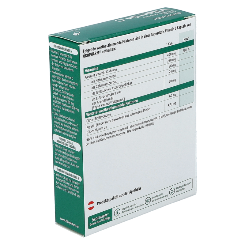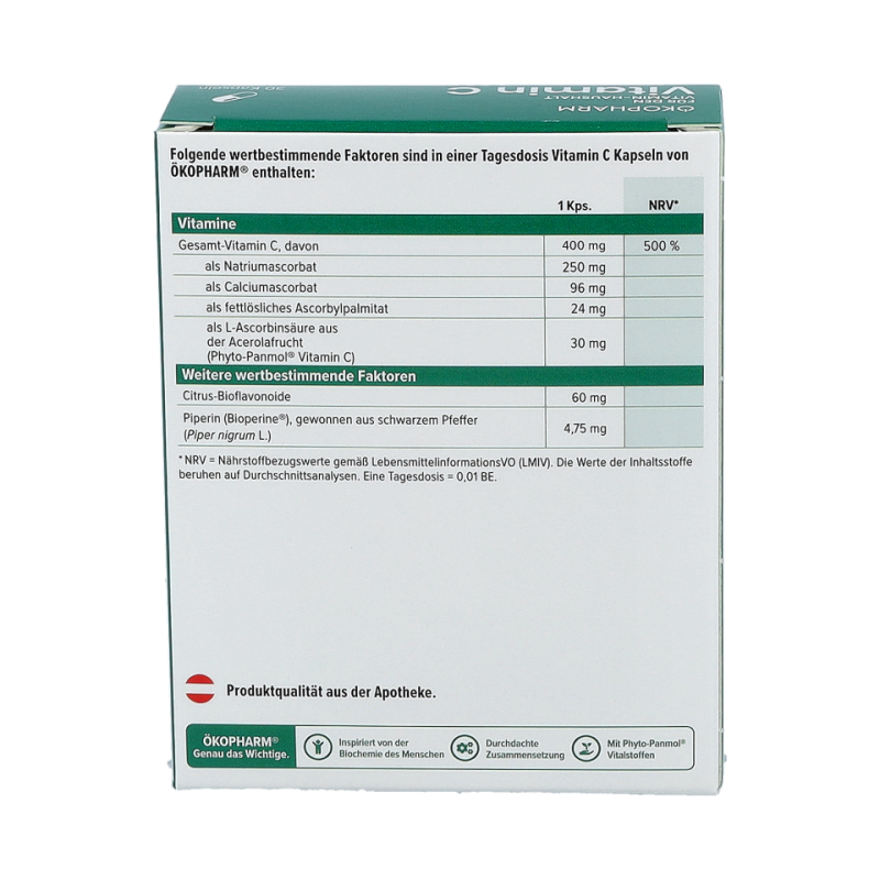 Ökopharm Vitamin C Komplex Kapseln ist durchdacht zusammengesetzt mit 1Vitamin C zur Unterstützung des Immunsystems, mit Citrus-Bioflavonoide und Acerolafruchtextrakt sowie 3 weiteren hochwertigen Vitamin C-Verbindungen zur optimalen Versorgung und mit Phyto-Panmol® Vitamin C aus der Acerolakirsche.