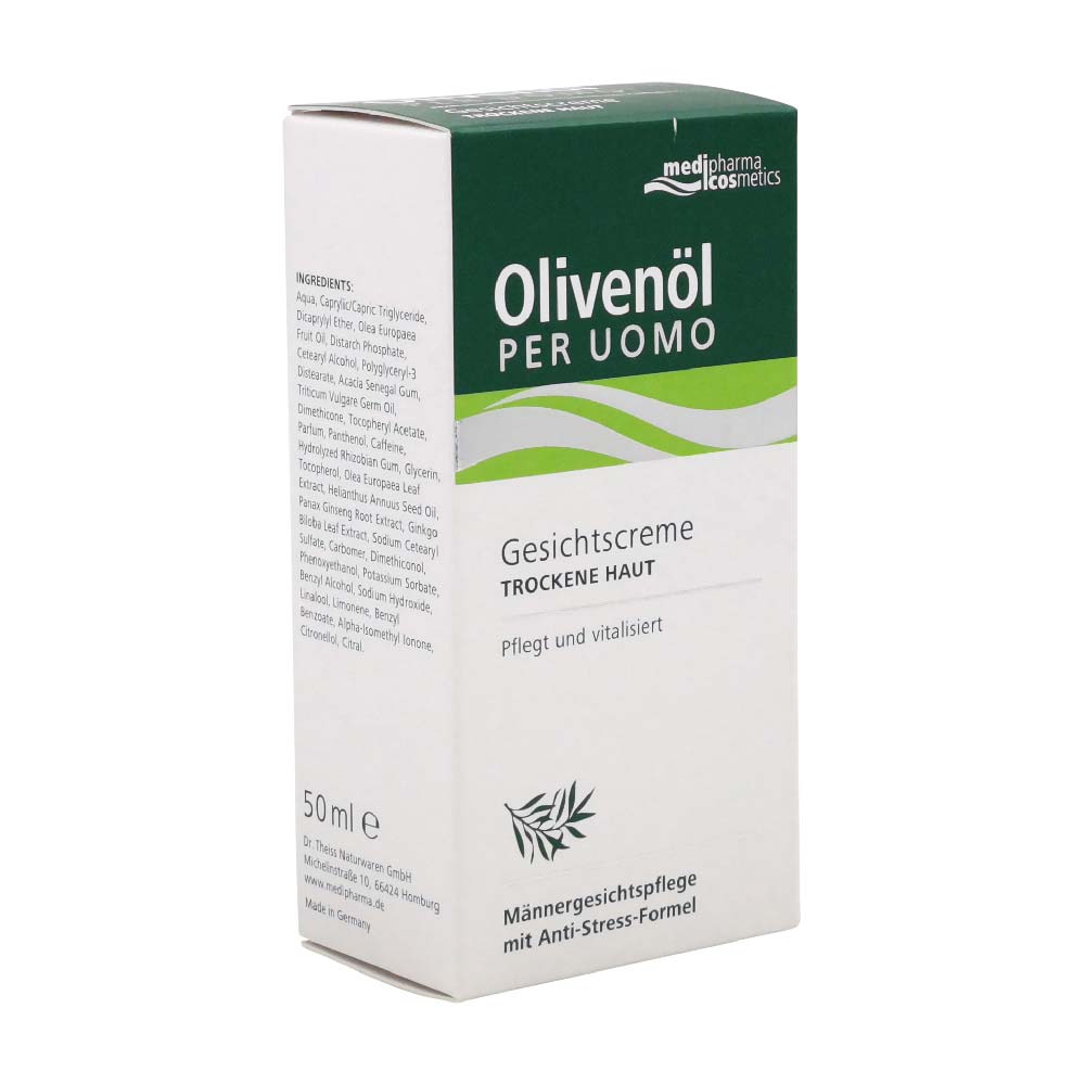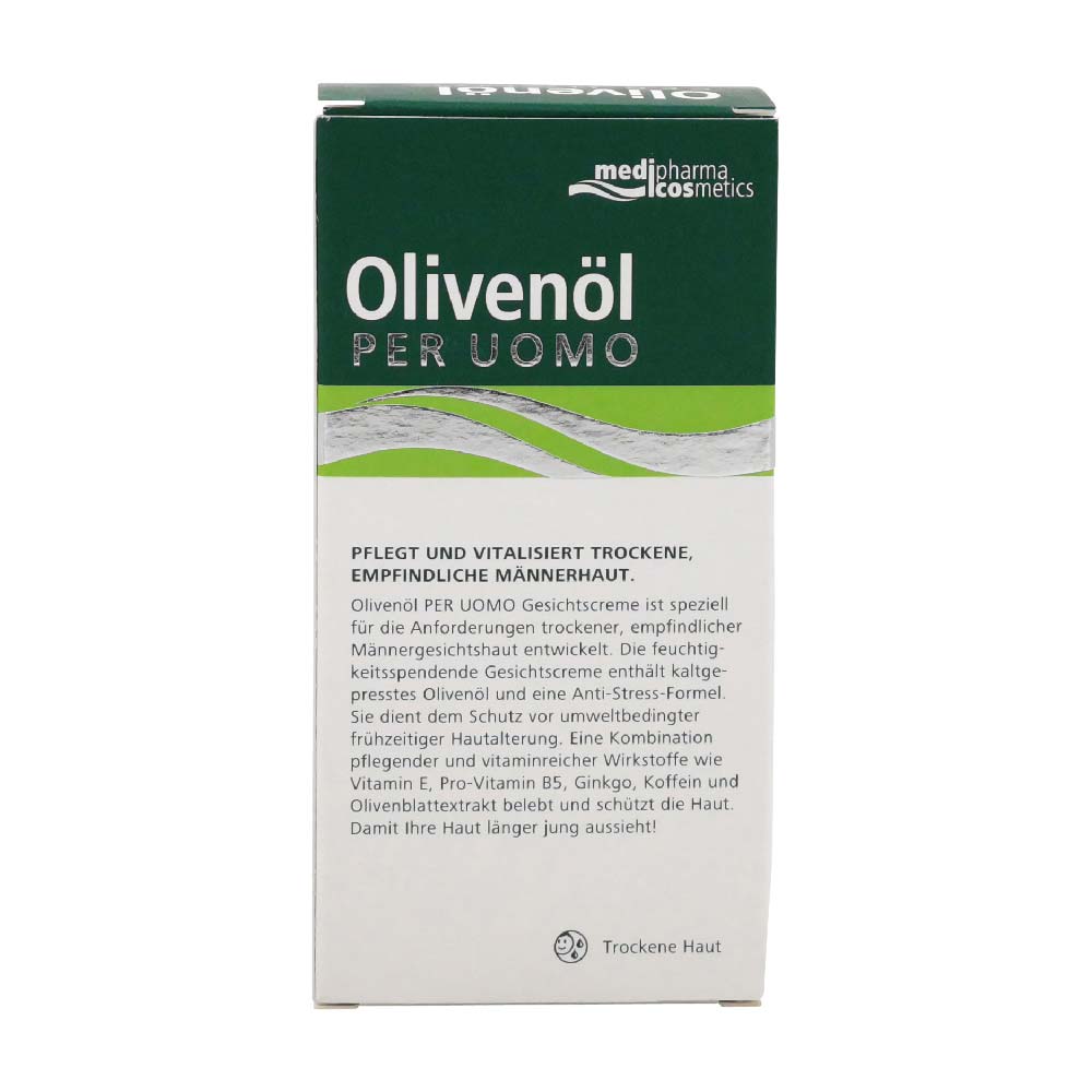 Medipharma Cosmetics Olivenöl Per Uomo Gesichtscreme pflegt speziell trockene Männerhaut. Die täglichen Strapazen der Haut können mit dieser Creme regeneriert werden. Dazu enthält das Produkt eine Anti-Stress-Formel und kalt gepresstes Olivenöl. Dieses ist besonders reichhaltig und macht raue, durch den Wind gegerbte Haut wieder streichelzart.