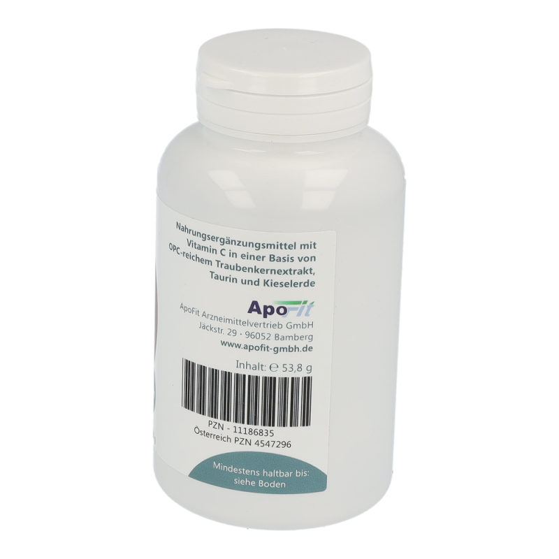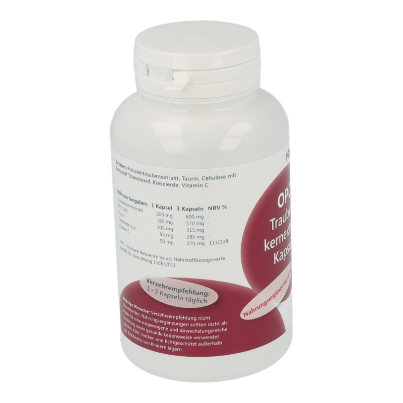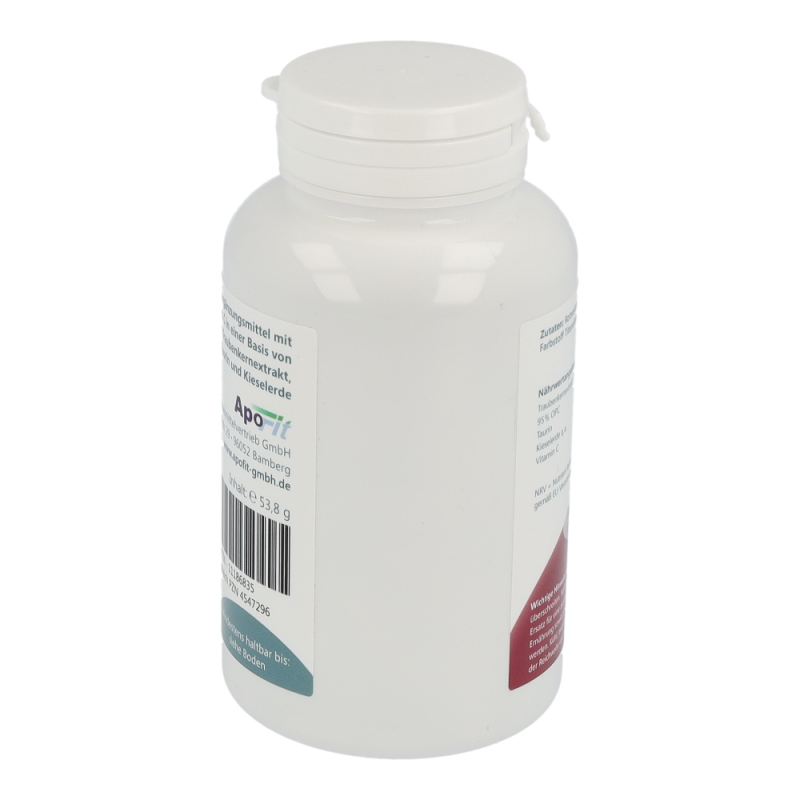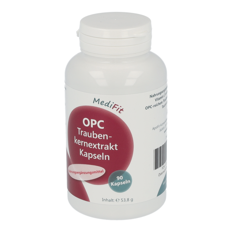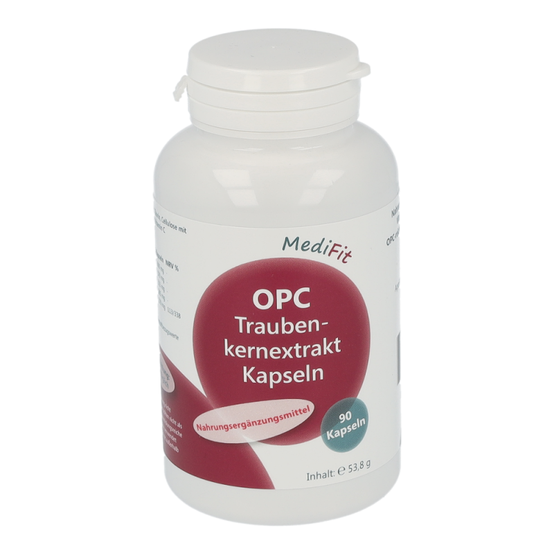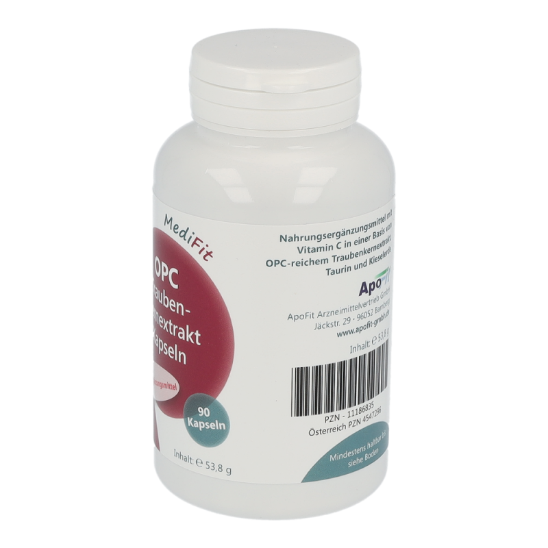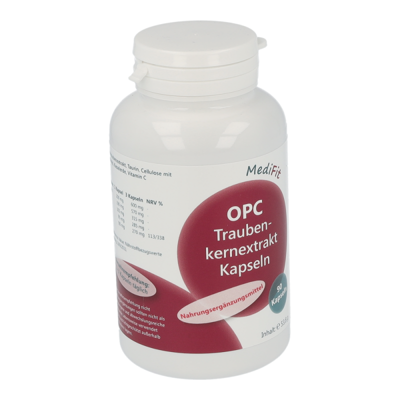 OPC Traubenkernextrakt Kapseln Medifit sind ein Nahrungsergänzungsmittel mit Vitamin C in einer Basis von OPC-reichem Traubenkernextrakt, Taurin und Kieselerde. Vitamin C leistet einen Beitrag zu einer normalen Kollagenbildung für eine normale Funktion der Blutgefäße, der Knochen und Knorpel, des Zahnfleischs sowie der Haut und Zähne.