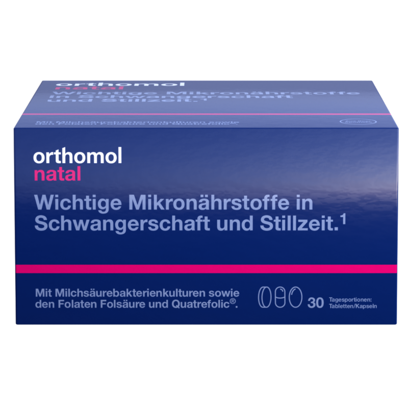Orthomol Natal® Tabletten und Kapseln 30 Stk. ist ein Nahrungsergänzungsmittel mit wichtigen Nährstoffe für die Entwicklung des Kindes während Schwangerschaft und Stillzeit sowie bei Kinderwunsch. Folsäure leistet einen Beitrag zum normalen mütterlichen Gewebewachstum in der Schwangerschaft. Zink trägt zu einer normalen Fruchtbarkeit und Fortpflanzung bei. Die ergänzende Aufnahme von Folsäure erhöht bei Schwangeren den Folatspiegel. Ein niedriger Folatspiegel ist bei Schwangeren ein Risikofaktor für die Entstehung von Neuralrohrdefekten beim heranwachsenden Fötus. Eisen trägt zu einer normalen Bildung von roten Blutkörperchen und Hämoglobin bei. Calcium, Magnesium, Zink, Eisen, Vitamin D, Vitamin B12 und Folsäure haben eine Funktion bei der Zellteilung. Vitamin C, Vitamin B6, Vitamin B12, Vitamin D, Folsäure, Eisen, Zink, Selen und Kupfer tragen zu einer normalen Funktion des Immunsystems bei