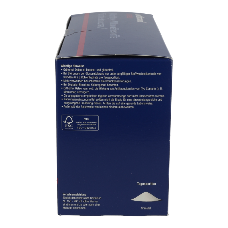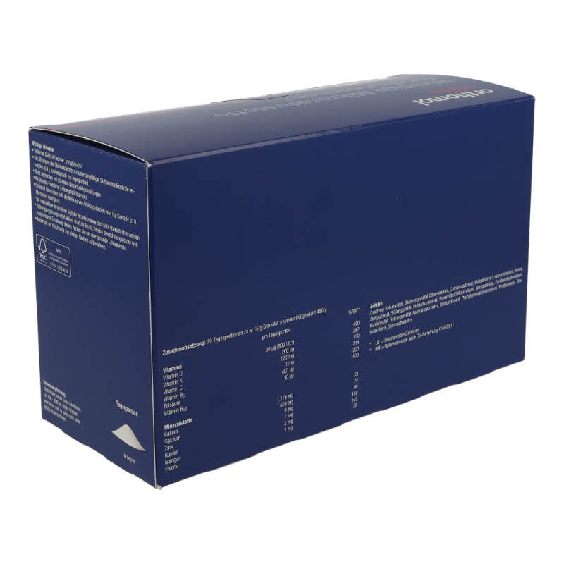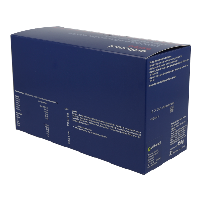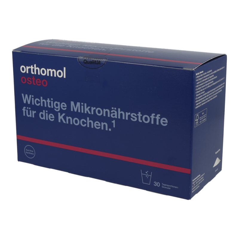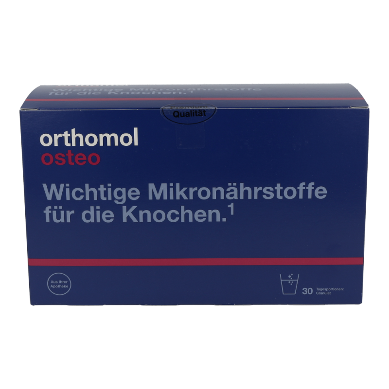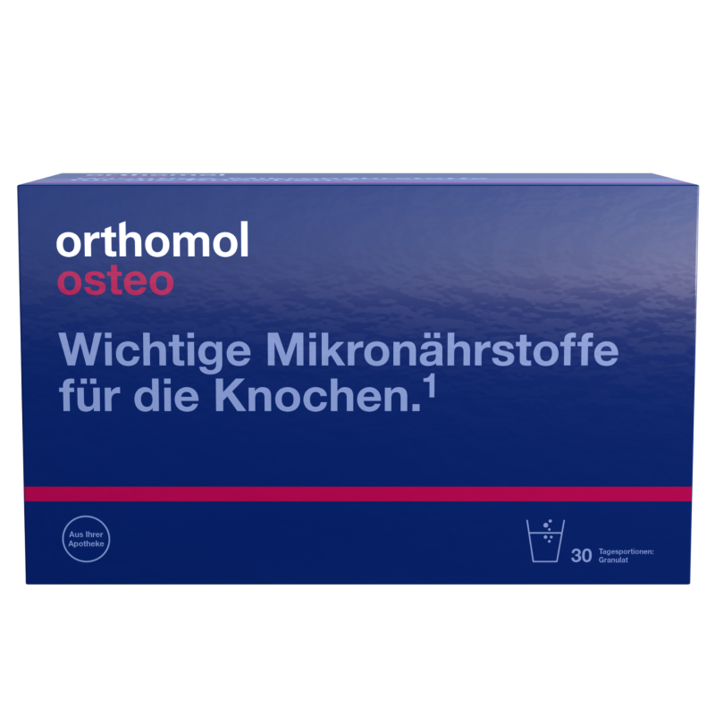 Orthomol® Osteo Granulat 30 Stk. ist ein Nahrungsergänzungsmittel mit wichtigen Mikronährstoffen für die Knochen. Vitamin D trägt zur normalen Aufnahme und Verwertung von Calcium und Phosphor sowie zur Aufrechterhaltung des normalen Calciumspiegels im Blut bei. Calcium wird für die Erhaltung normaler Knochen benötigt. Vitamin C ist an der normalen Kollagenbildung beteiligt und trägt zur normalen Funktion des Knochens bei – jetzt bestellen für starke und gesunde Knochen!