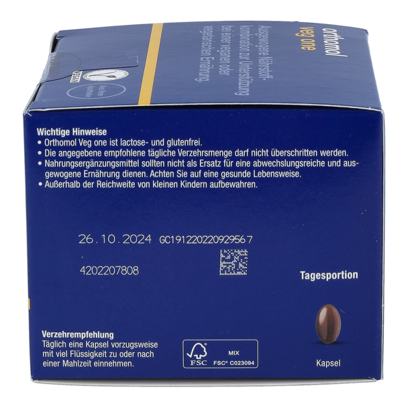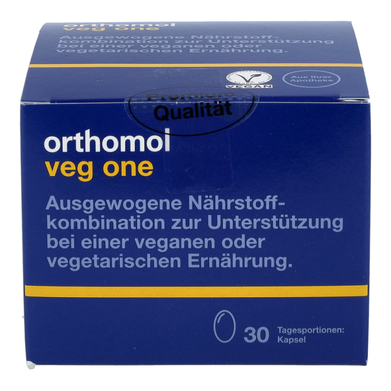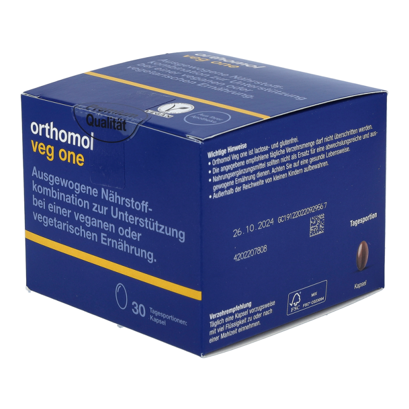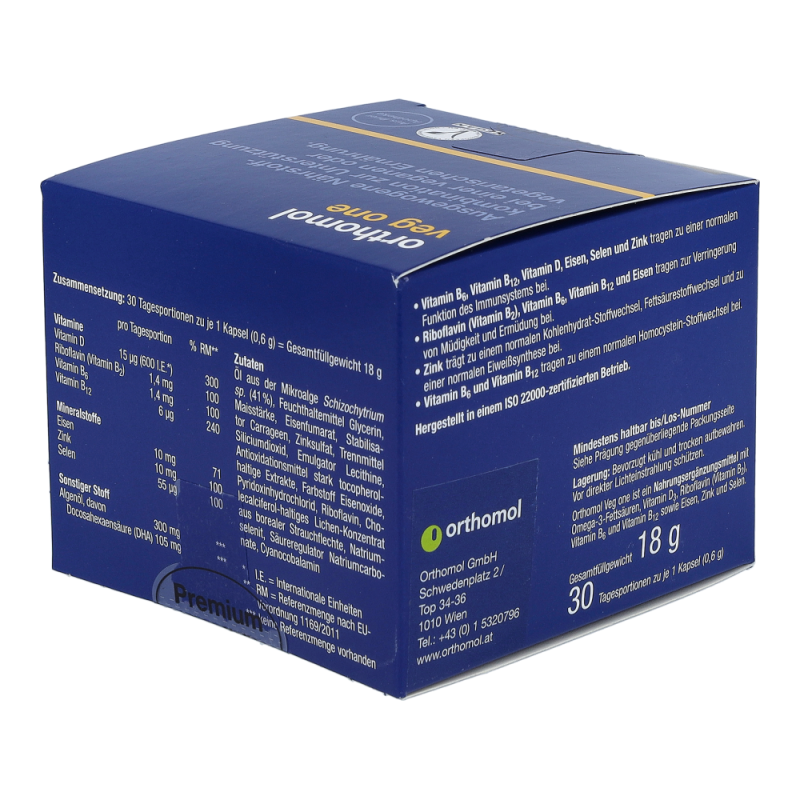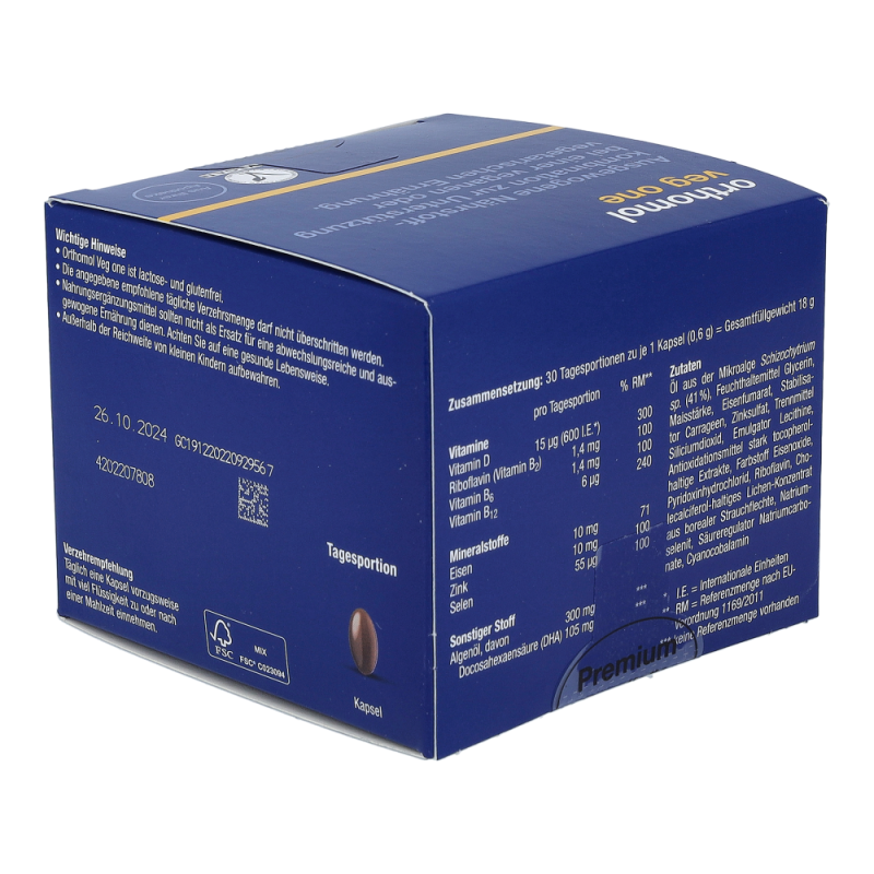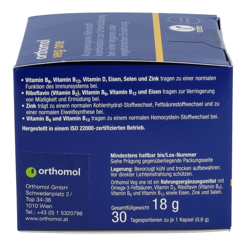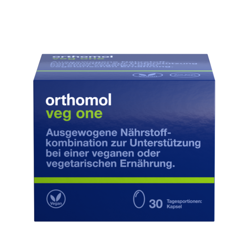 Orthomol Veg one® Kapseln 30 Stk. ist ein Nahrungsergänzungsmittel zur Unterstützung bei einer veganen oder vegetarischen Ernährung. Vitamin B6 und Vitamin B12 tragen zu einem normalen Homocystein-Stoffwechsel sowie gemeinsam mit Vitamin D zu einer normalen Funktion des Immunsystems bei. Vitamin B2 (Riboflavin), Vitamin B6, Vitamin B12 und Eisen tragen zur Verringerung von Müdigkeit und Ermüdung bei. Zink trägt zu einem normalen Kohlenhydrat-Stoffwechsel, Fettsäurestoffwechsel und zu einer normalen Eiweißsynthese sowie zur Erhaltung normaler Haut bei. Selen und Zink tragen zur Erhaltung normaler Haare und Nägel bei.