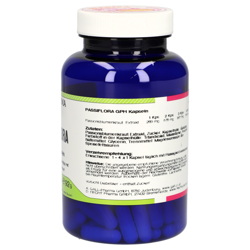 Die Passionsblume gehört zur Familie der Passionsblumengewächse(Passifloraceae) und war schon denamerikanischen Ureinwohnern bekannt. Sie ist für ihreberuhigenden Eigenschaften bekannt und wird gernebei Schlafstörungen verwendet, ebenso werden den Inhaltsstoffender Pflanze krampf- und angstlösende Eigenschaftennachgesagt, sodass sie auch bei zahlreichennervös bedingten Beschwerden verwendet werden kann.Häufig äußert sich Stress in Einschlafproblemen. PassifloraGPH Kapseln eignen sich besonders als Nahrungsergänzungzur Unterstützung beim Einschlafen, vor allem,wenn die psychische Komponente eine Rolle spielt.