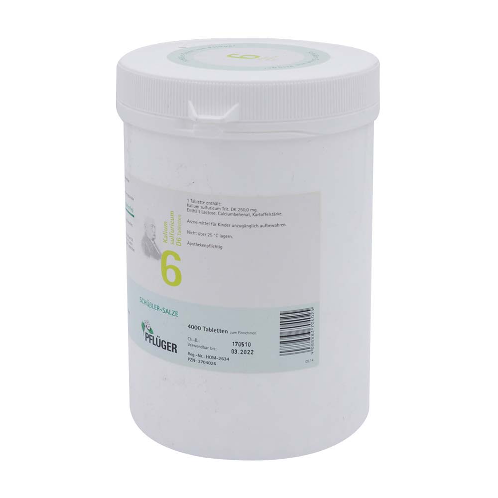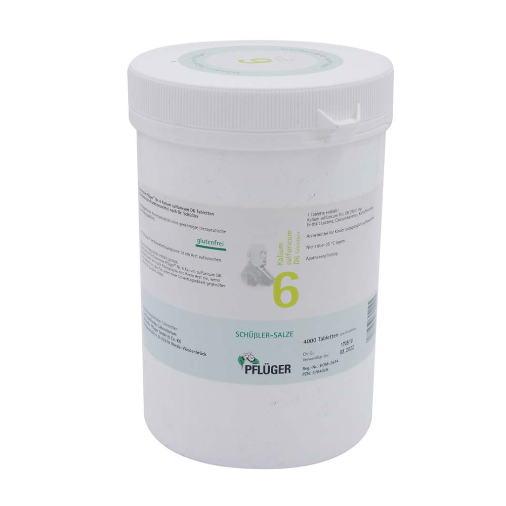 Pflüger Dr. Schüßler Nr. 6 Kalium Sulfuricum steigert die Leistungsfähigkeit der Leber und ist durch seine austreibende Wirkung, an den Entgiftungsprozessen im Körper maßgeblich beteiligt. Es kommt in Haut, Schleimhäuten, Nägeln, Knochen sowie der Muskulatur vor und fördert alle Vorgänge, welche für den Transport des aufgenommenen Sauerstoffs notwendig sind.