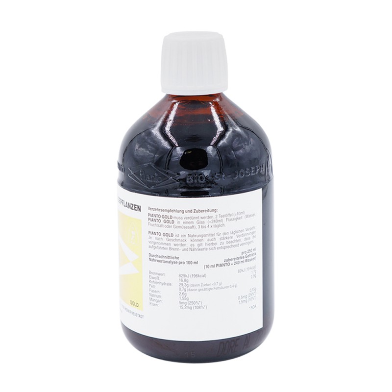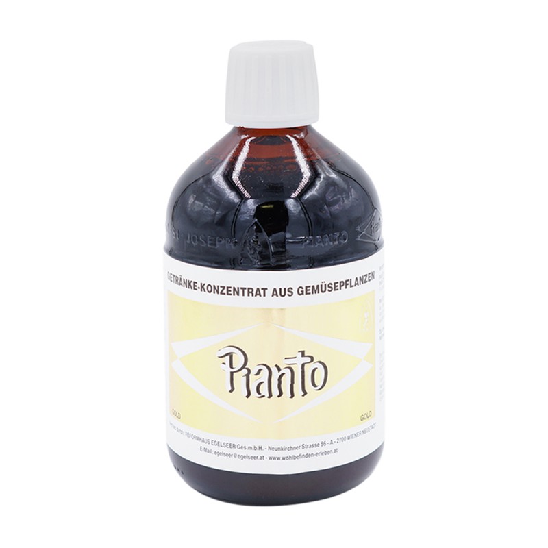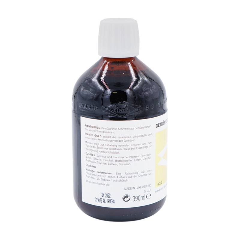 Pianto Getränkekonzentrat Gold ist ein Getränke-Konzentrat aus Gemüsepflanzen, das verdünnt werden muss. Es enthält natürliche Mineralstoffe und Aminosäuren von den Gemüsen.