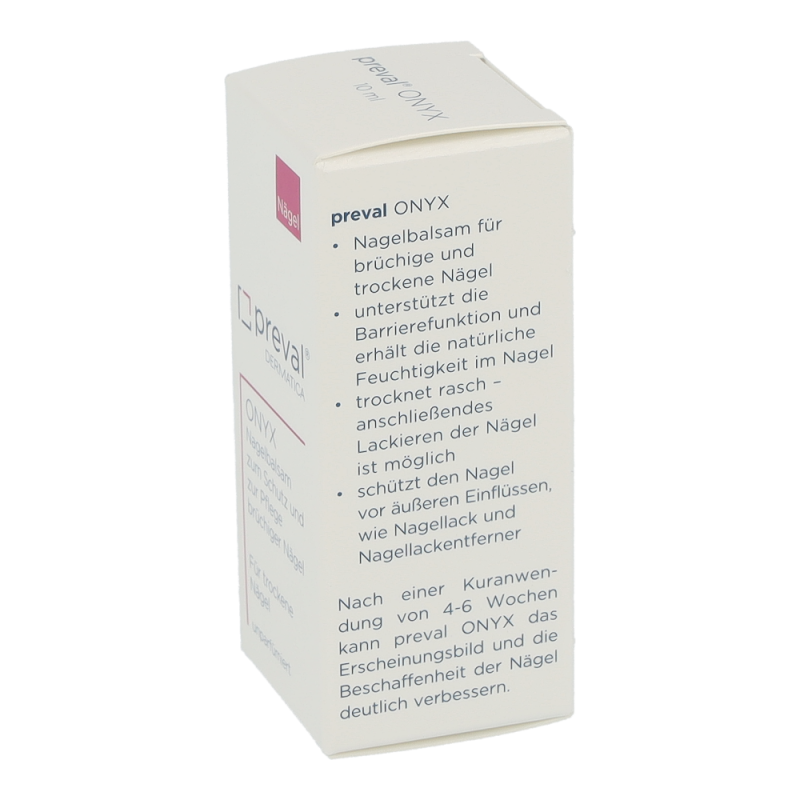 preval ONYX morgens und abends (nach Bedarf mehrmals täglich) auf die Nägel und die Nagelhaut auftragen. Der Nagelbalsam trocknet rasch und verleiht den Nägeln einen seidenmatten Glanz. Anschließendes Lackieren der Nägel ist möglich, wobei während der 4-6 wöchigen Kuranwendung davon abgeraten wird, da das Präparat nicht durch den Nagellack hindurch wirkt.