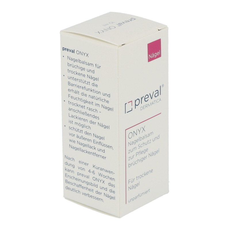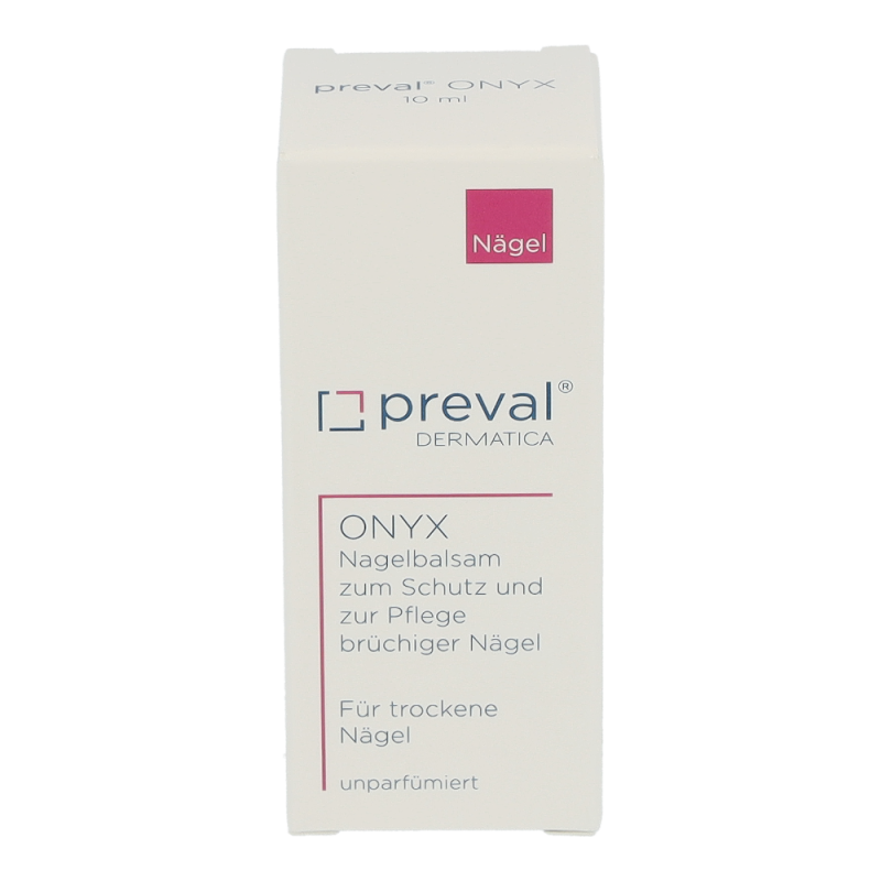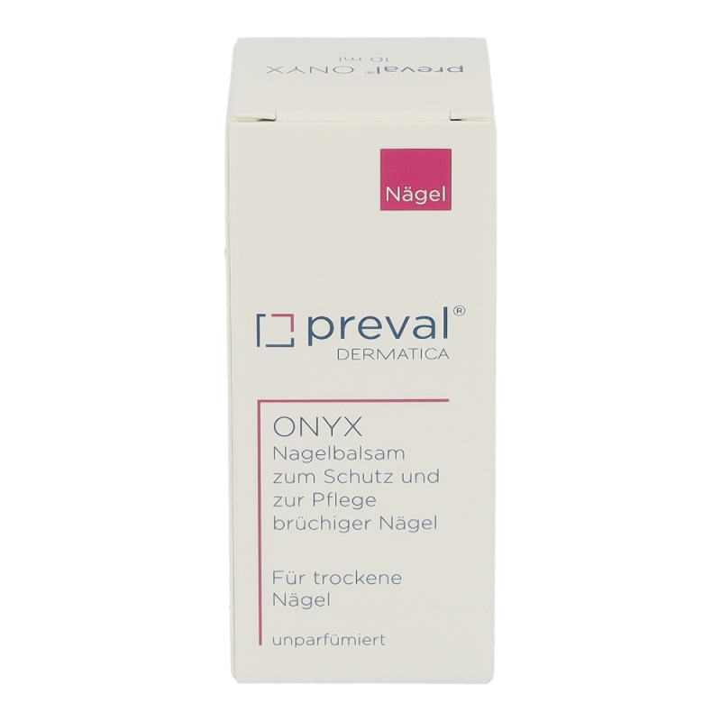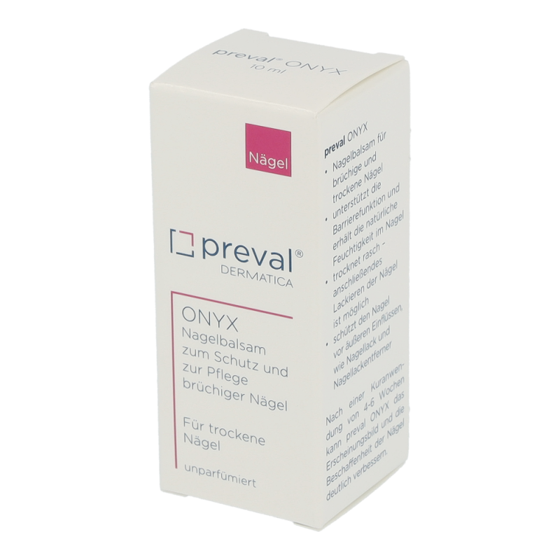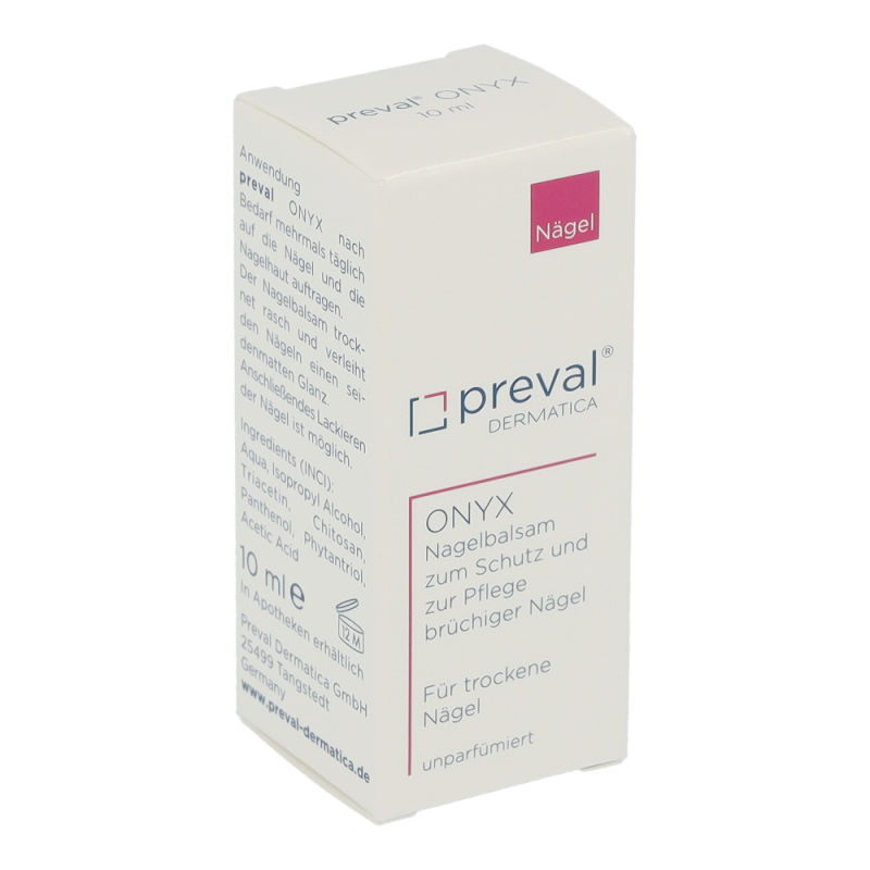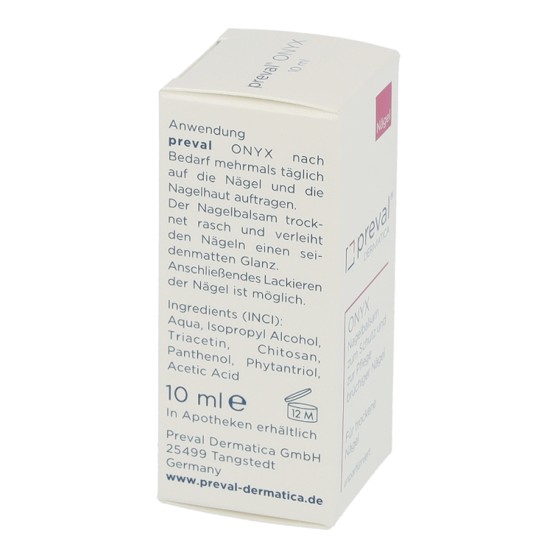 preval ONYX ist ein Nagelbalsam für brüchige und trockene Nägel.Das in preval ONYX enthaltene Chitosan verbindet sich mit dem Keratin der Nagelplatte und bildet so eine Schutzschicht gegen äußere Einflüsse, wie z.B. gegen Nagellack und der besonders austrocknenden Wirkung von Lackentfernern. Panthenol und Phytantriol erhöhen den Feuchtigkeitsgehalt im Nagel und sorgen somit für mehr Elastizität. Nach 4-6 Wochen Anwendung von preval ONYX sind die Nägel wieder elastisch, glänzend und widerstandsfähig.