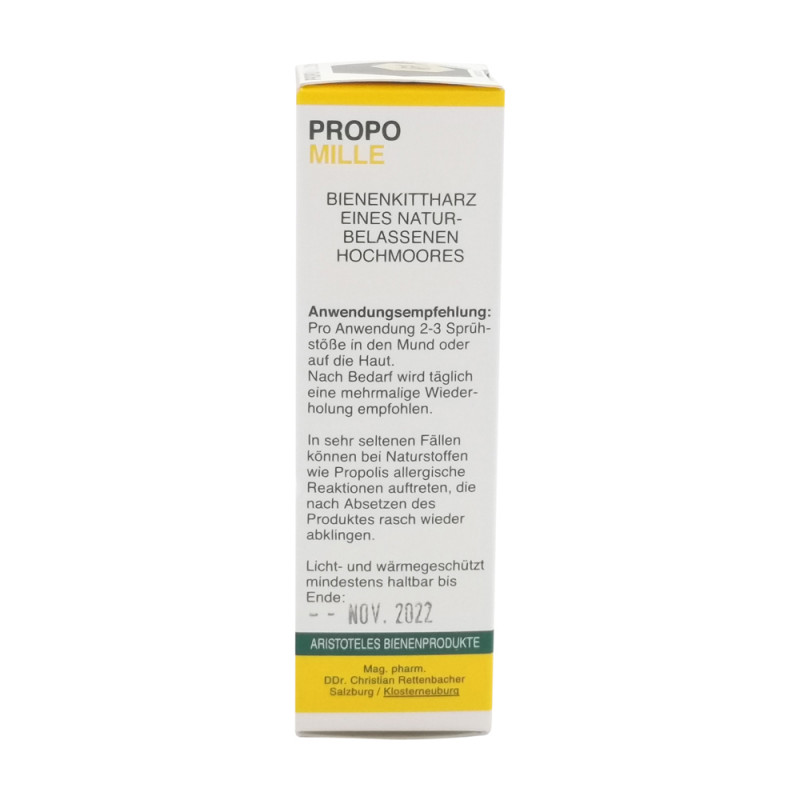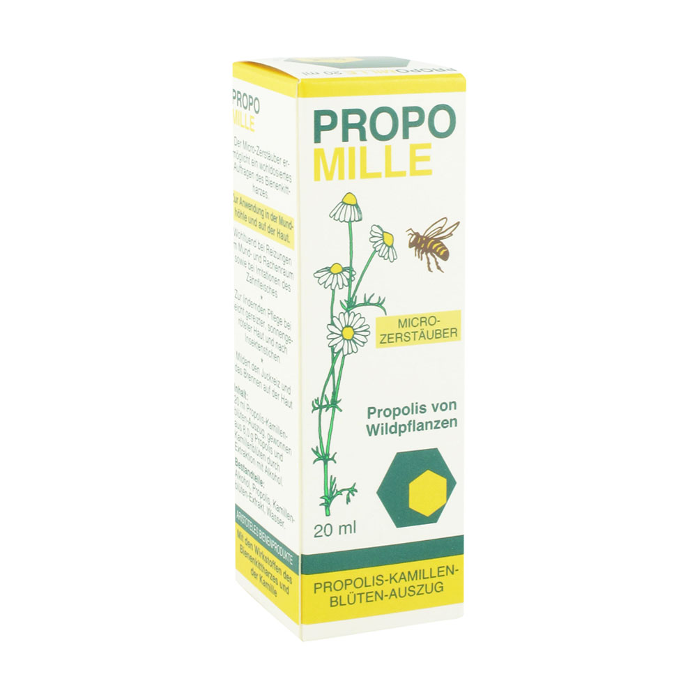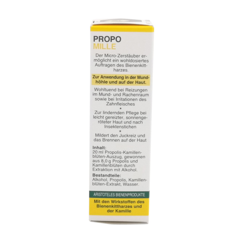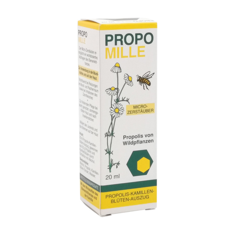 Propomille Propolis Spray ist eine Propolis-Kamillen-Tinktur zur Anwendung in der Mundhöhle und auf der Haut. Wohltuend bei Reizungen im Mund- und Rachenraum sowie bei Irritationen des Zahnfleisches. Optimal auch zur Pflege nach Insektenstichen oder bei leichtem Sonnenbrand. Mildert den Juckreiz und das Brennen auf der Haut.Der Microzerstäuber ermöglicht ein wohldosiertes Auftragen der Naturstoffe. Beim Aufsprühen bildet sich auf der Mundschleimhaut ein beständiger Propolisfilm. Auf der Haut entsteht eine Microschicht mit aromatischem Propolisgeruch..