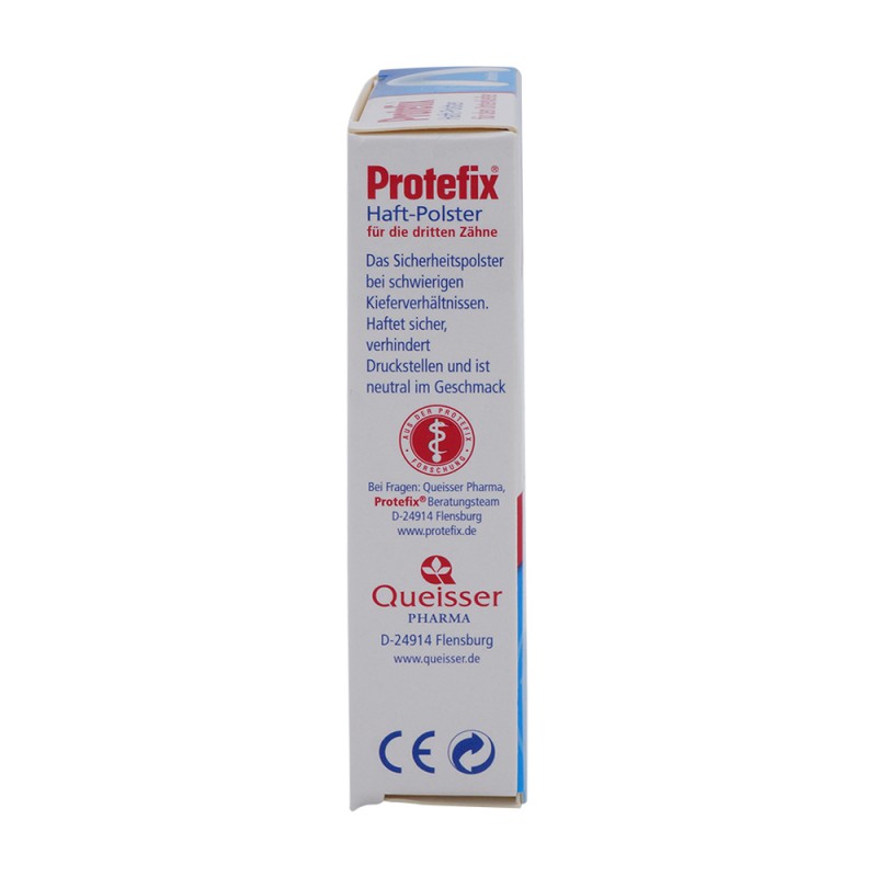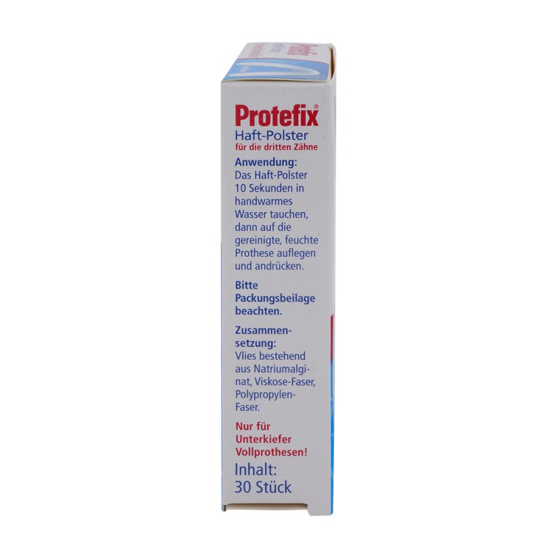 Die Haft-Polster bestehen aus feinem, gaumenfreundlichem Vliesgewebe, das Natriumalginat enthält und nach kurzem Anfeuchten die Haftkraft zusätzlich unterstützt. So bieten die Polster wirksamen Schutz vor Druckstellen und Entzündungen. Neben ihrer Bedeutung bei Interimsprothesen haben sie sich auch bei starker Kieferrückbildung – hier besonders beim Unterkiefer – bewährt, wenn dieser sehr schmal oder stark abgeflacht ist. Für Träger von Vollprothesen mit extremen Haftproblemen sind Protefix® Haft-Polster daher oft die letzte Rettung, wenn sonst nichts mehr halten will.