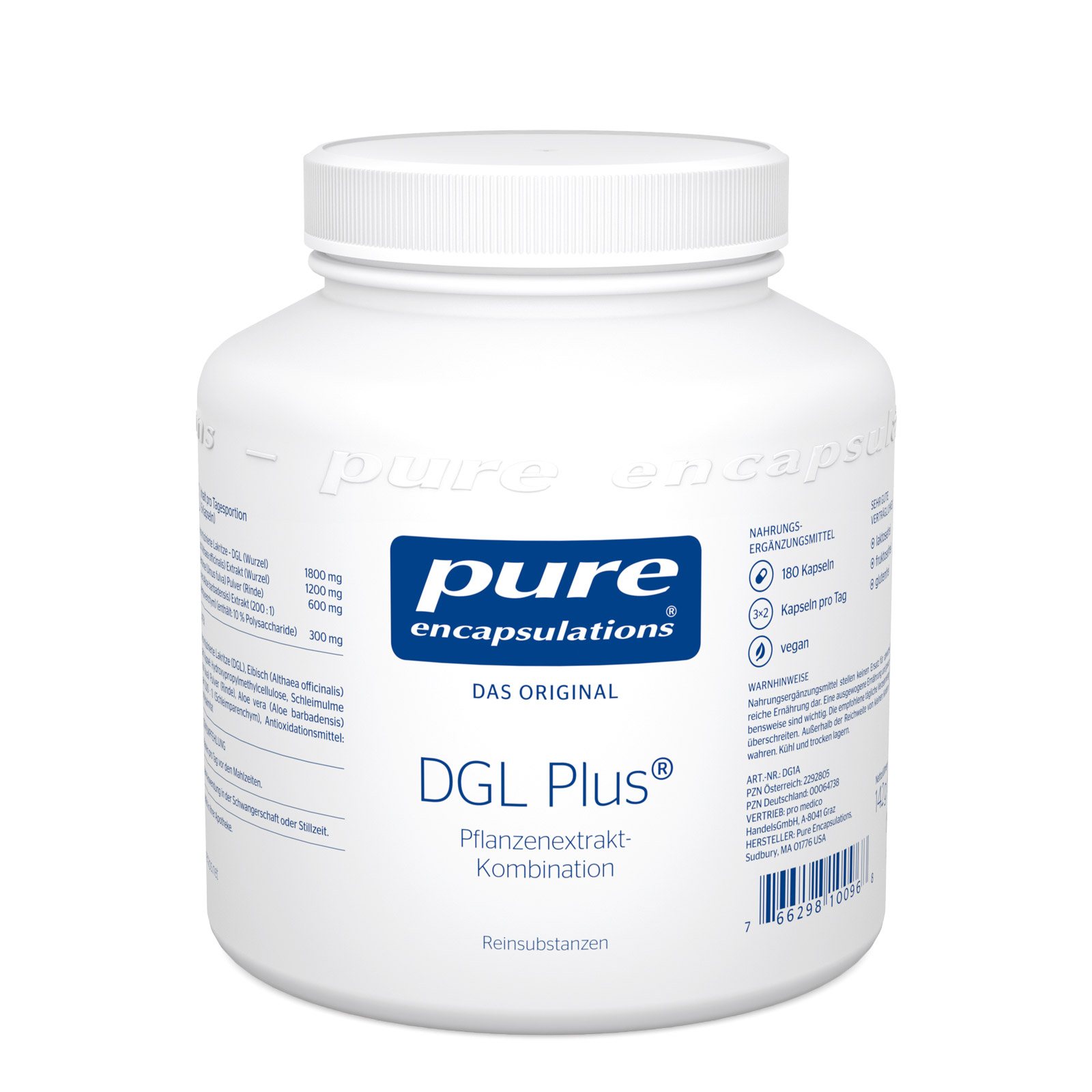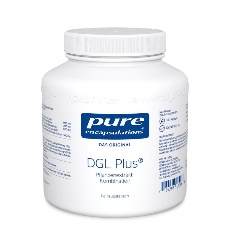 Pure Encapsulations® DGL Plus® enthält Extrakte aus Lakritze, Eibisch,Schleimulme und Aloe vera, welche reich an Schleimstoffensind. Die rein pflanzlichen Inhaltsstoffe sind perfekt aufeinanderabgestimmt. Pure Encapsulations® DGL Plus® basiert auf hochwertigen,naturidenten Reinsubstanzen.Höchstmögliche Qualitätsstandards garantieren, dass die verwendetenInhaltsstoffe maximal verträglich sind und eine optimaleBioverfügbarkeit aufweisen. Deshalb gelten wir auch weltweit alsdas Original bei Reinsubstanzen. Zum leichten Leben bedarf eswenig. Pure Encapsulations® DGL Plus® ist laktosefrei, fruktosefreiund glutenfrei. Auch auf künstliche Farb- und Geschmacksstoffehat man bei Pure Encapsulations® verzichtet.
