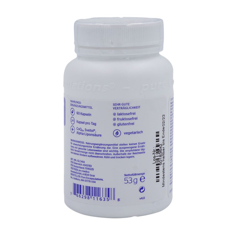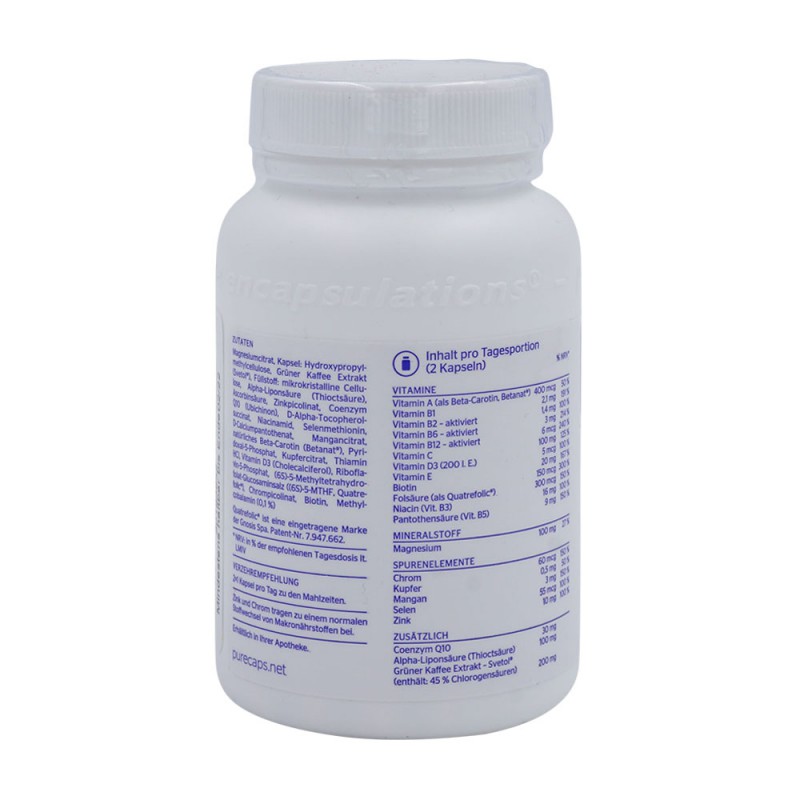 Die mit der Nahrung aufgenommene Glukose ist der wichtigsteEnergielieferant des menschlichen Körpers. Unter Mitarbeit vonVitaminen und Spurenelementen wird diese in der Zelle in Energieumgewandelt. Die gezielte Zufuhr von Mikronährstoffen kann dieEinstellung des Stoffwechsels unterstützen und so zum allgemeinenWohlbefinden beitragen.Die innovative Rezeptur enthält eine Kombination aus Mikronährstoffen,die für den Blutzuckerspiegel sowie die Verwertung derMakronährstoffe (Eiweiße, Fette, Kohlenhydrate) wichtig sind. Soliefert sie Nährstoffe zur täglichen Ergänzung der Nahrung, wieChrom, Vitamin B6 und Zink. Besonders wird die Formel durch denZusatz von Svetol®, einem standardisierten Extrakt aus GrünemKaffee, Coenzym Q10 und Alpha-Liponsäure.