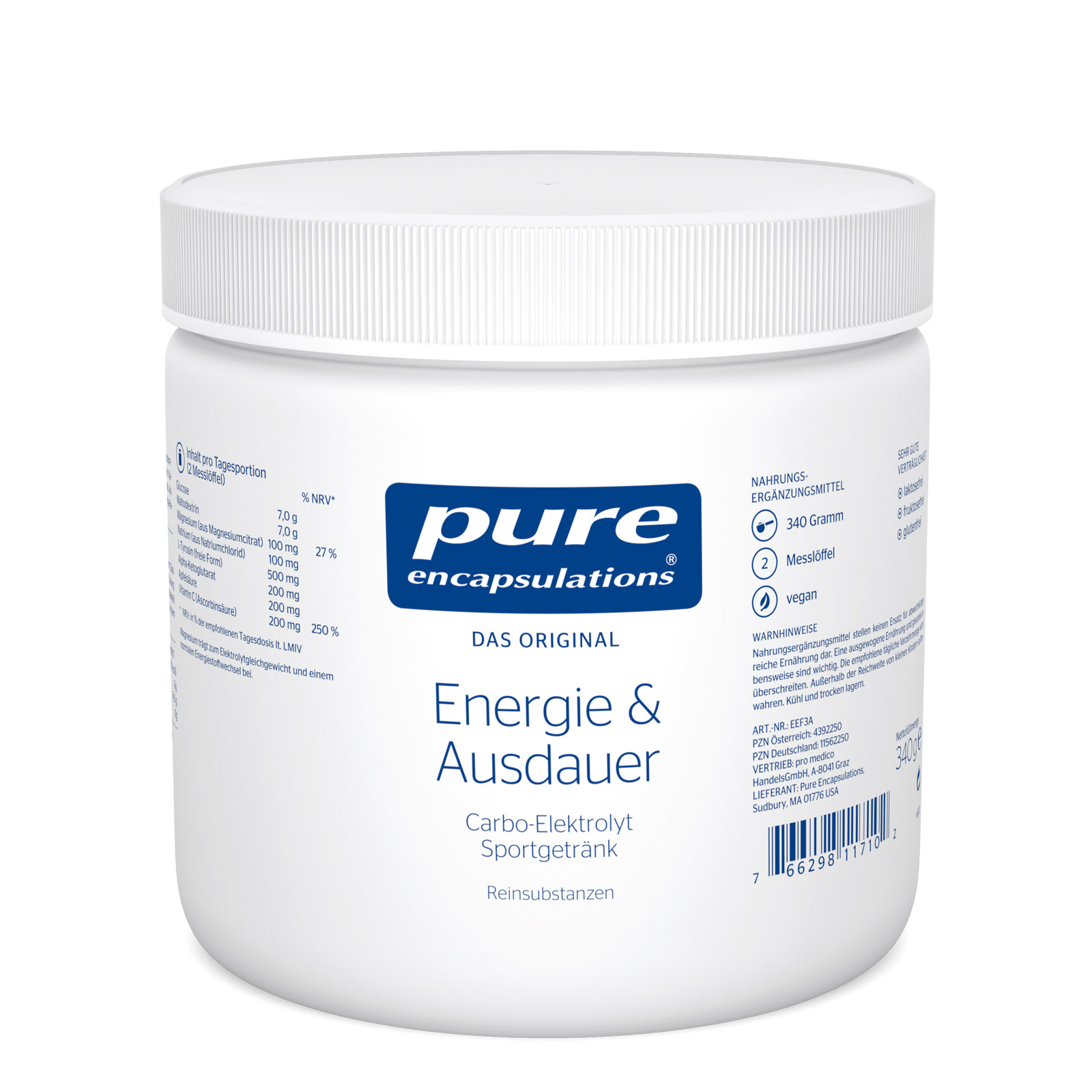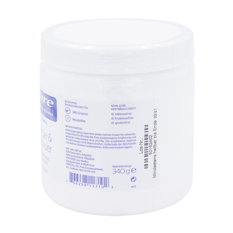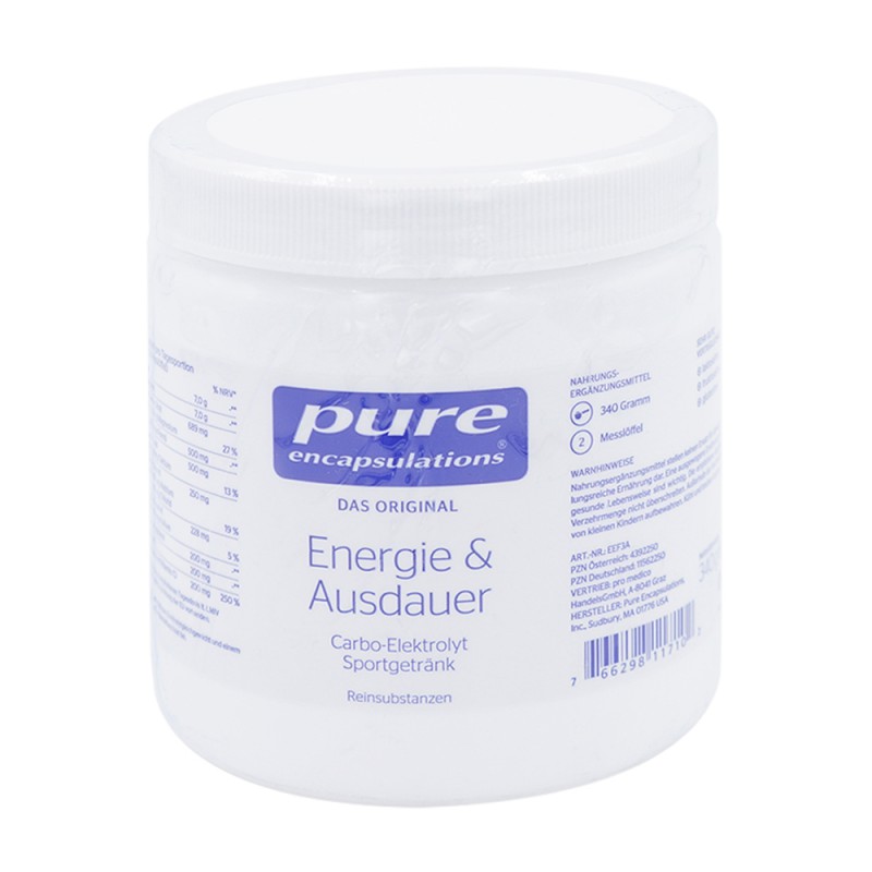 Pure Encapsulations® Energie & Ausdauer enthält komplexeKohlenhydrate zur Aufrechterhaltung der Ausdauerleistung undElektrolyte, um Verluste durch vermehrtes Schwitzen auszugleichen.Durch den Mineralstoff Magnesium wird eine normale Muskelfunktionunterstützt. Maltodextrinsowie Glucose sind gute Energiequellenund sorgen für einen ausgeglichenen Blutzuckerspiegel.Vitamin C trägt zu einer normalen Funktion des Immunsystems beiund dient als Beitrag zum Schutz der Zellen vor oxidativem Stress.