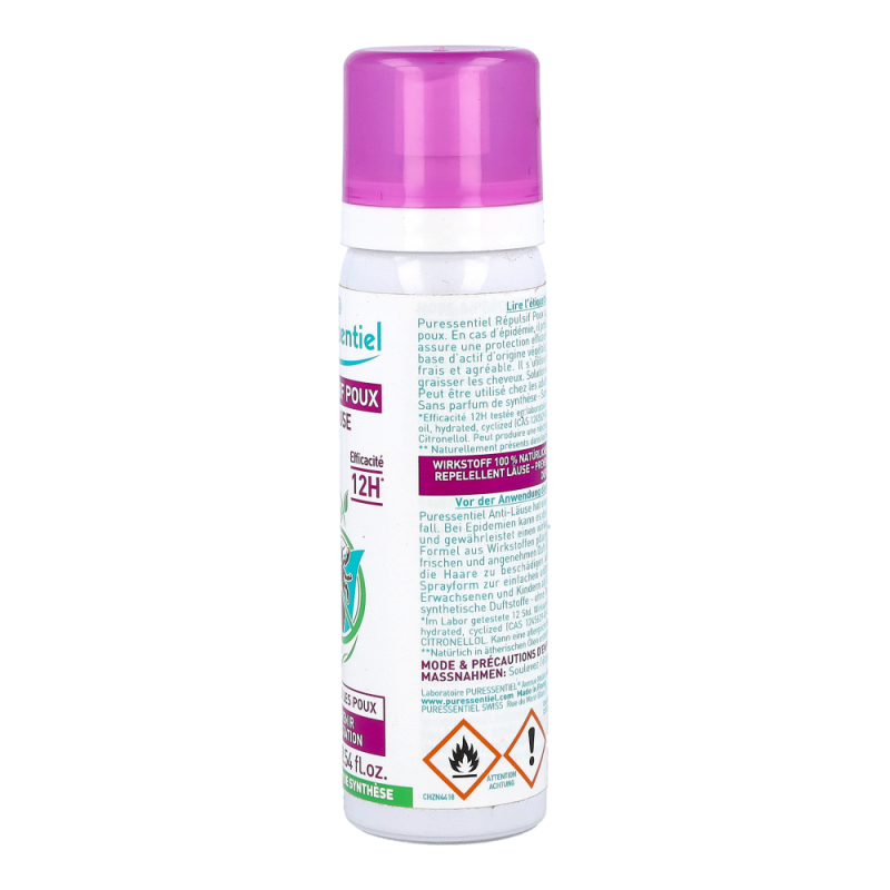 Puressentiel Anti-Läuse Abwehr Spray hat eine präventive Wirkung gegen Läusebefall. Bei Epidemien kann es den Befall auf der Kopfhaut verhindern und gewährleistet einen wirksamen Schutz bis zu 12 Stunden. Seine Formel aus Wirkstoffen pflanzlicher Ursprungs hinterlässt einen frischen und angenehmen Duft. Es kann täglich benutzt werden, ohne die Haare zu beschädigen oder zu fetten.