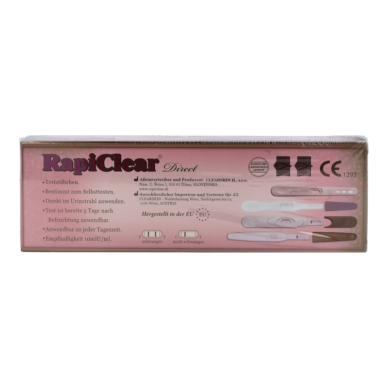 Rapiclear Direct Schwangerschaftstest ist ein schneller Test und dient der qualitativen Feststellung von menschlichem Choriongonadotropin (hCG) im Harn, mit dessen Hilfe man Schwangerschaft feststellen kann.