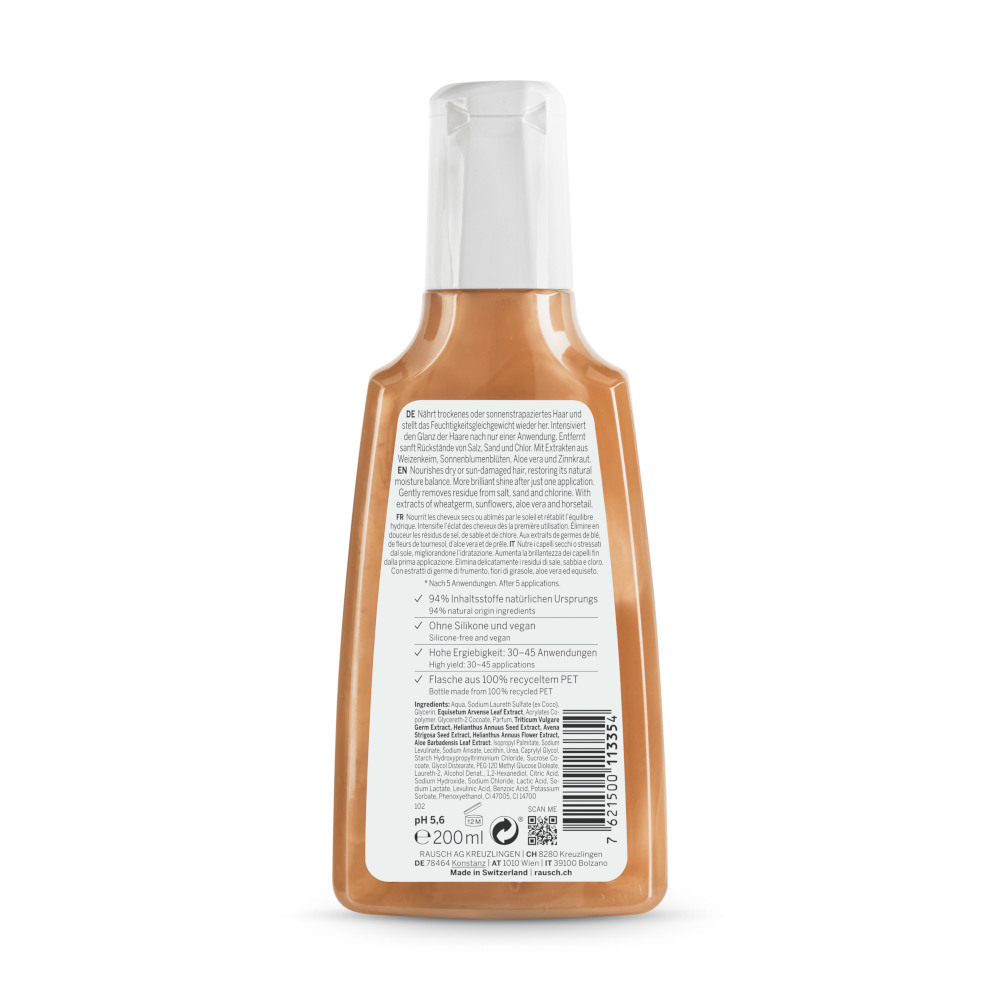 Das Shampoo, das trockenes und sonnenstrapaziertes Haar repariert. Es nährt das Haar und spendet dabei viel Feuchtigkeit. Die After-Sun-Formel ist ein wahrer Balsam für das Haar, intensiviert den Glanz nach nur einer Anwendung und sorgt für eine deutlich verbesserte Haarstruktur. Nach einem Tag am Strand oder am Pool entfernt es sanft und effizient Rückstände von Salz, Sand und Chlor. Mit wertvollen Extrakten aus Weizenkeim, Sonnenblumenblüten, Aloe vera und Zinnkraut.