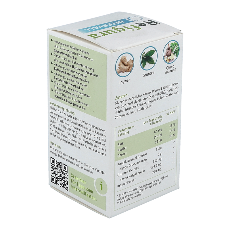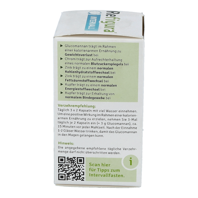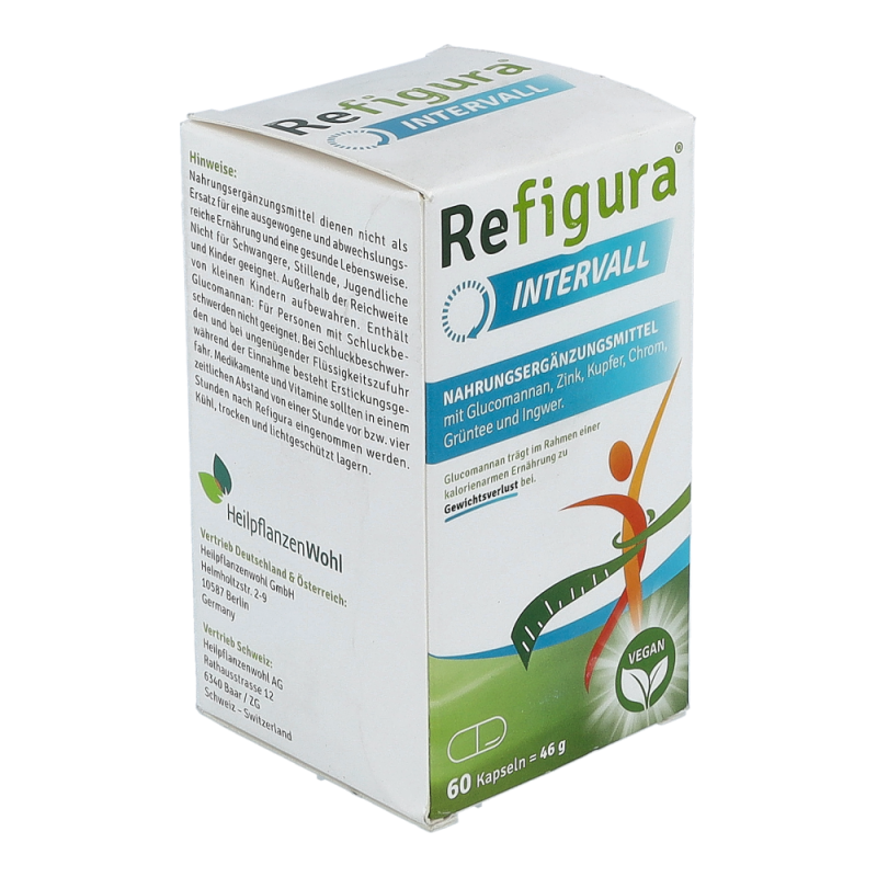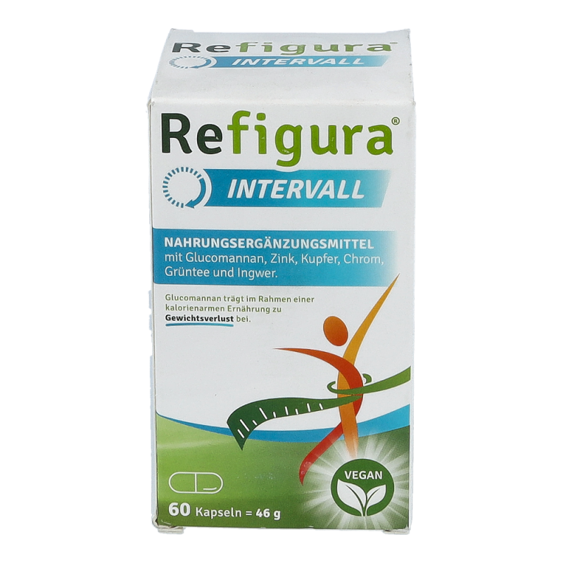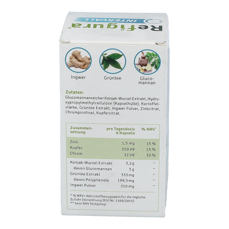 Refigura Intervall Nahrungsergänzungsmittel mit Glucomannan, Zink, Kupfer, Chrom, Grüntee und Ingwer.