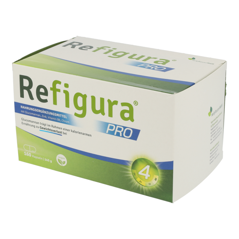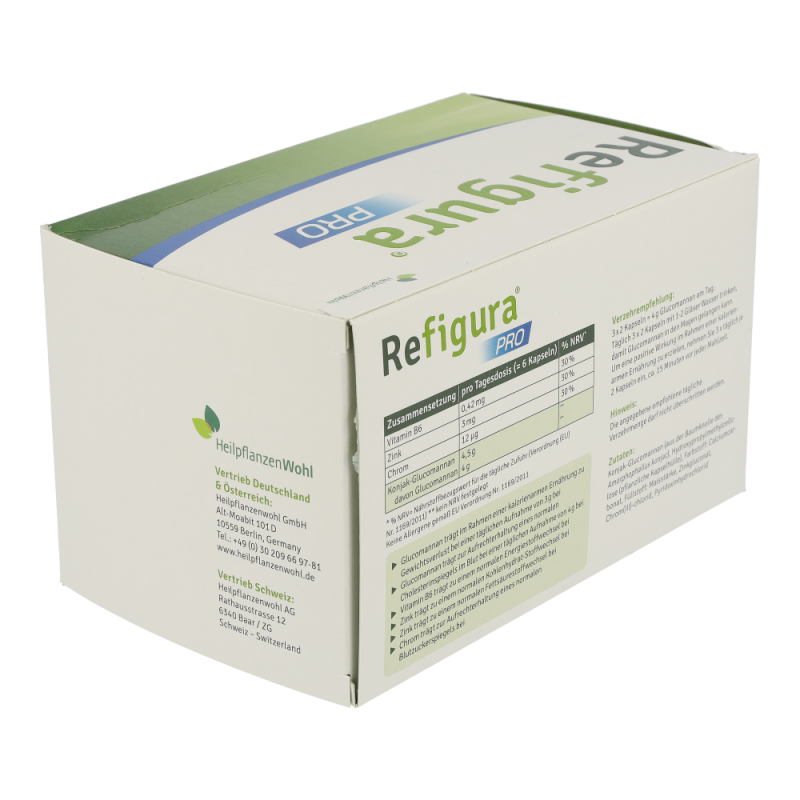 Refigura Pro ist ein Nahrungsergänzungsmittel mit Glucomannan, Vitamin B6, Zink und Chrom