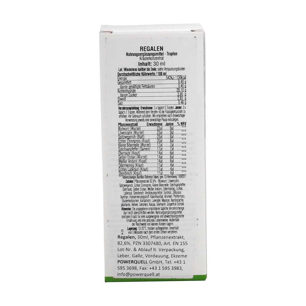 Regalen Kräuterextrakt Tropfen sind ein Nahrungsergänzungsmittel mit sekundärstoffreichen Pflanzenextrakten als flüssiges Kräuterkonzentrat. Die Tropfen sind insbesondere für eine Förderung einer antioxidativen und regenerationsfördernden Ernährung hilfreich.