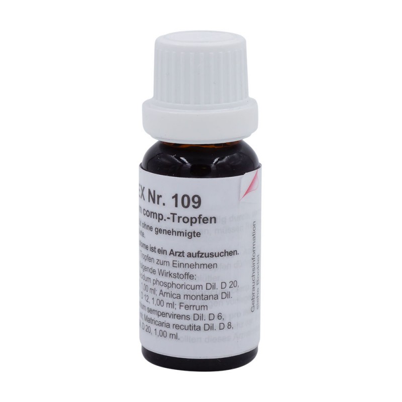 Regenaplex Nr. 109 hilft gegen Kopfschmerzen bei Wetterfühligkeit. Die quasi nach einem Baukastensystem zusammengestellten Regenaplexe sind homöopathische Komplexmittel mit jeweiligen Nummernbezeichnungen.