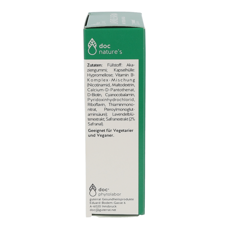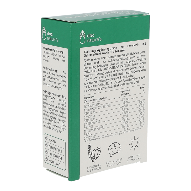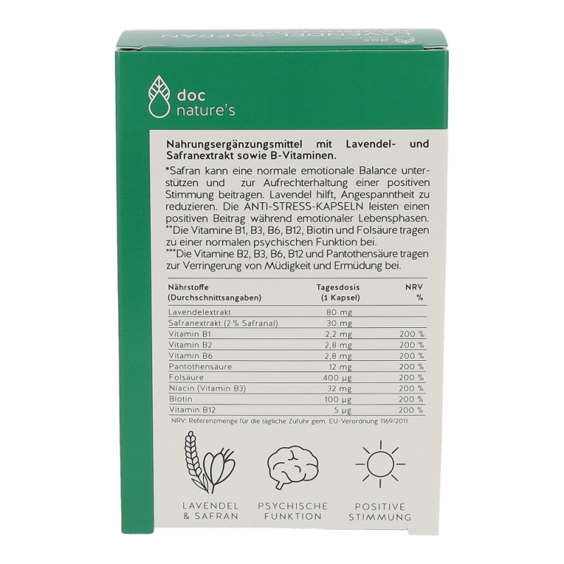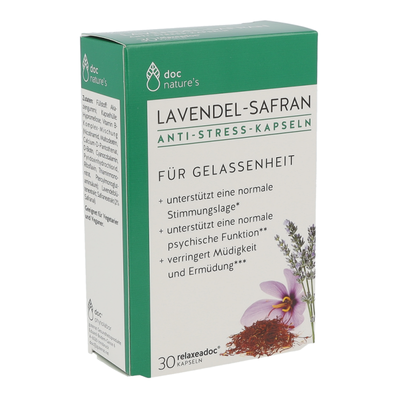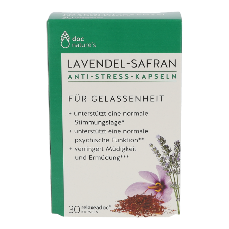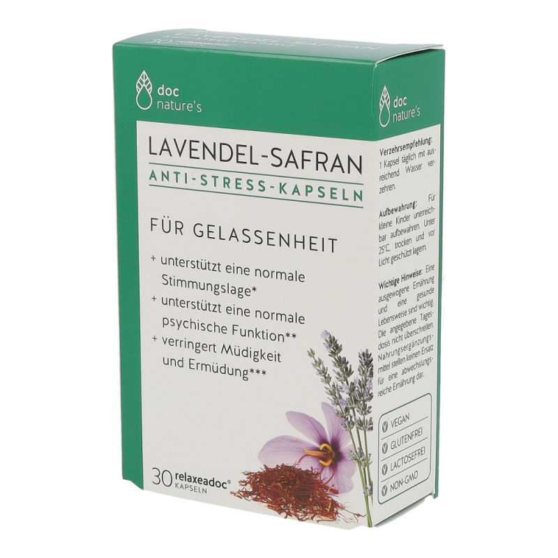 Relaxeadoc ist ein Nahrungsergänzungsmittel mit Extrakten aus Safran und Lavendel sowie B-Vitaminen. Safran kann eine normale emotionale Balance unterstützen und zur Aufrechterhaltung einer positiven Stimmung beitragen. Lavendel leistet einen Beitrag zur normalen inneren Ruhe während emotionaler Lebensphasen. Die Vitamine B1, B3, B6, B12, Biotin und Folsäure tragen zu einer normalen psychischen Funktion bei, sowie gemeinsam mit Pantothensäure zur Verringerung von Müdigkeit und Ermüdung.
