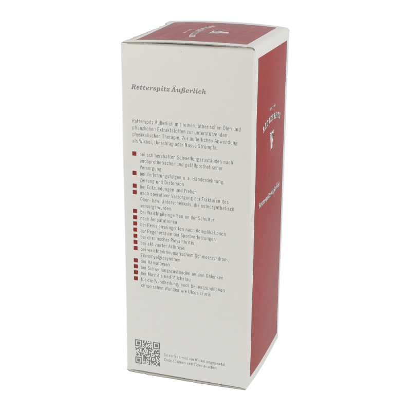 Einfach, effektiv und hilfreich. Die natürlichen Inhaltsstoffe in Retterspitz Äußerlich gehen in die typische und bewährte Dunstatmosphäre über und beschleunigen die Regenerationsprozesse. Physikalische Therapien wie Wickel, Auflagen oder Nasse Strümpfe beschleunigen die Stoffwechselvorgänge und die Durchblutung. Zugleich beeinflussen die Behandlungen positiv die Psyche: Entspannung und Wohlbefinden stellen sich ein.