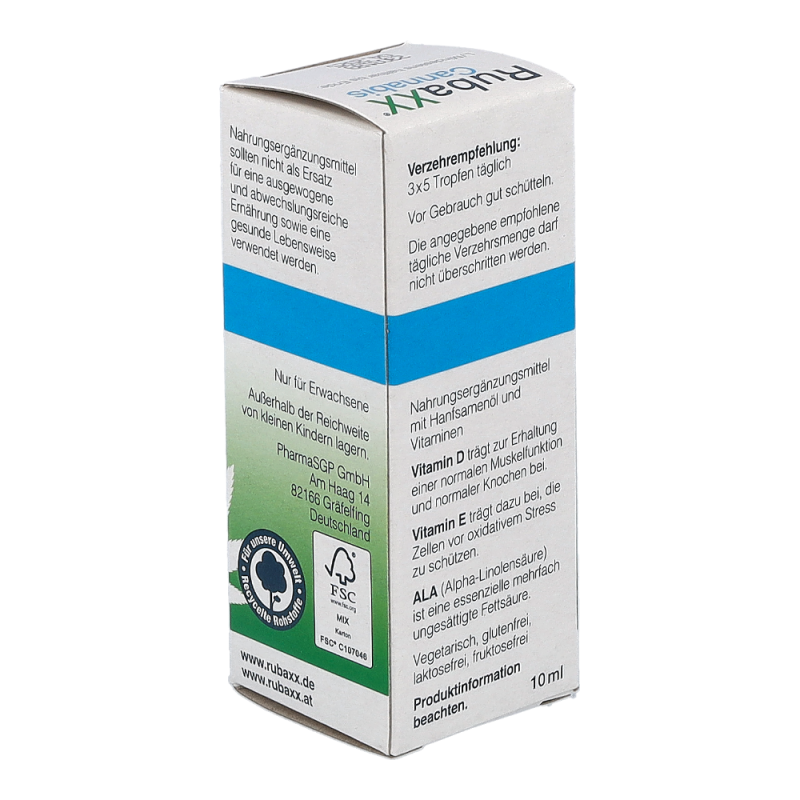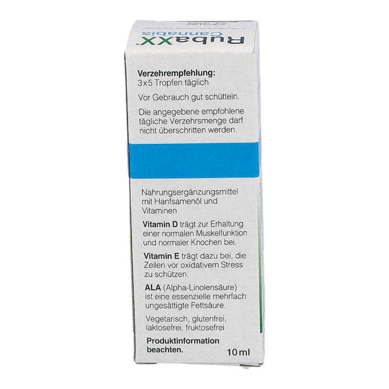 RubaXX Cannabis ist ein Nahrungsergänzungsmittel. Für RubaXX Cannabis wird ein hochwertiges Cannabissamenöl verwendet. Das Geniale: Cannabissamen haben keine berauschende Wirkung.Die Produktion findet unter strengsten deutschen Qualitätsstandards statt. RubaXX Cannabis ist vegan, sowie frei von Gluten, Lactose, Fructose, Gelatine und sämtlichen Zusatzstoffen. Empfohlen wird ein Verzehr von bis zu 3&thinsp x&thinsp 5 Tropfen täglich. RubaXX Cannabis wurde speziell für den täglichen Verzehr entwickelt.Die angegebene empfohlene tägliche Verzehrsmenge darf nicht überschritten werden. Neben- und Wechselwirkungen sind beim Verzehr von RubaXX Cannabis nicht bekannt. Nahrungsergänzungsmittel sollten nicht als Ersatz für eine ausgewogene und abwechslungsreiche Ernährung sowie eine gesunde Lebensweise verwendet werden. Das Produkt ist außerhalb der Reichweite von kleinen Kindern aufzubewahren.