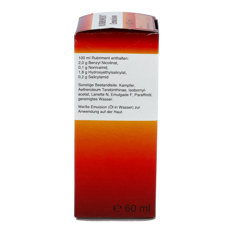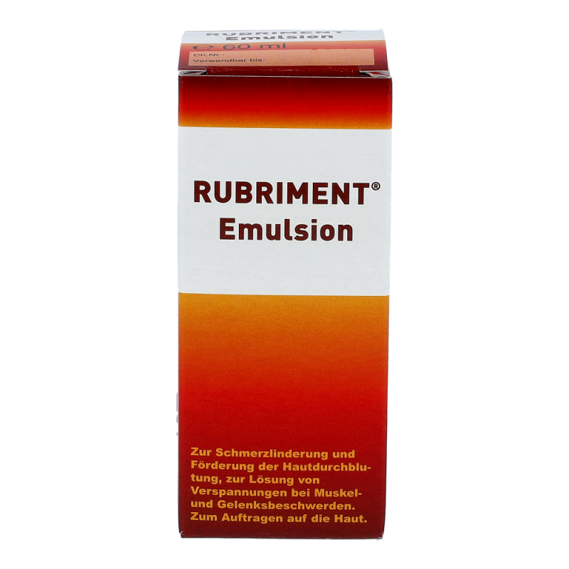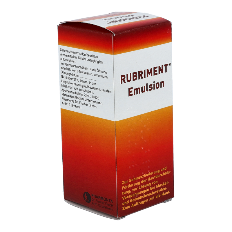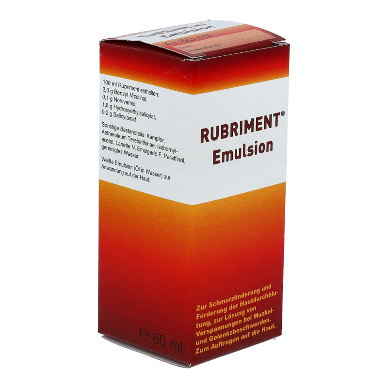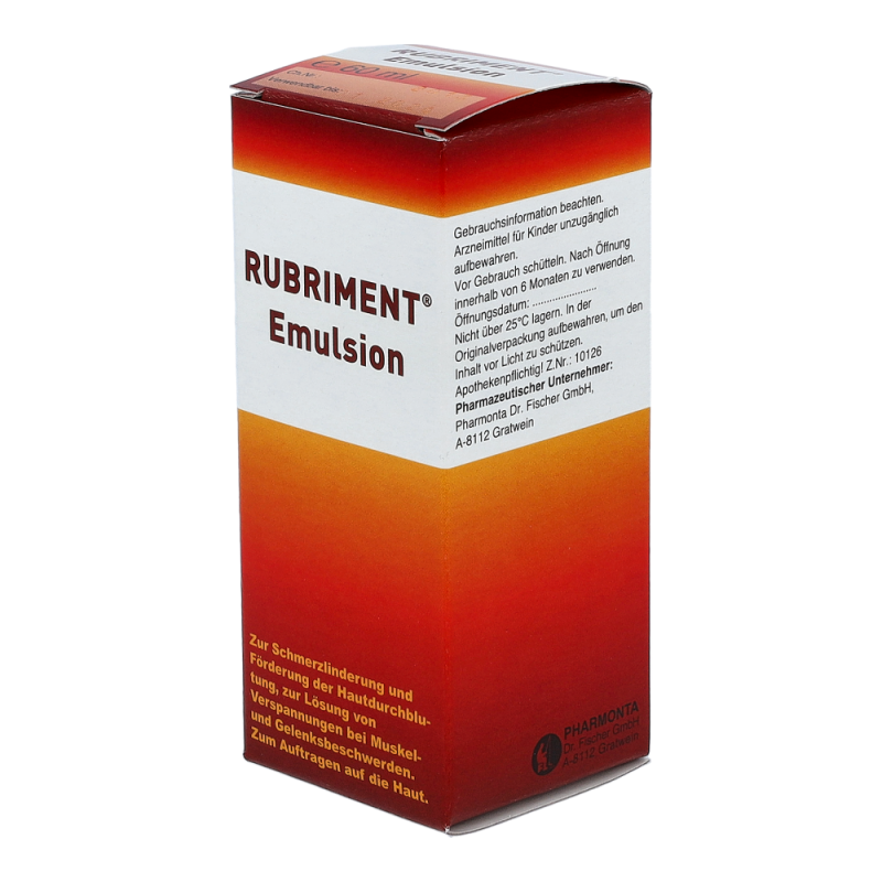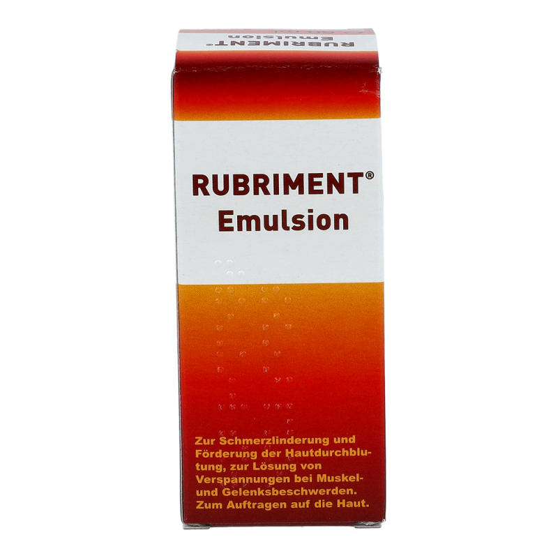 Rubriment Emulsion ist ein durchblutungsförderndes Schmerzmittel zum Einreiben. Die Kombination der Wirkstoffe lindert rasch Schmerzen, hilft Muskelkrämpfe zu lösen und beschleunigt die Heilung durch die Anregung des Gewebestoffwechsels.