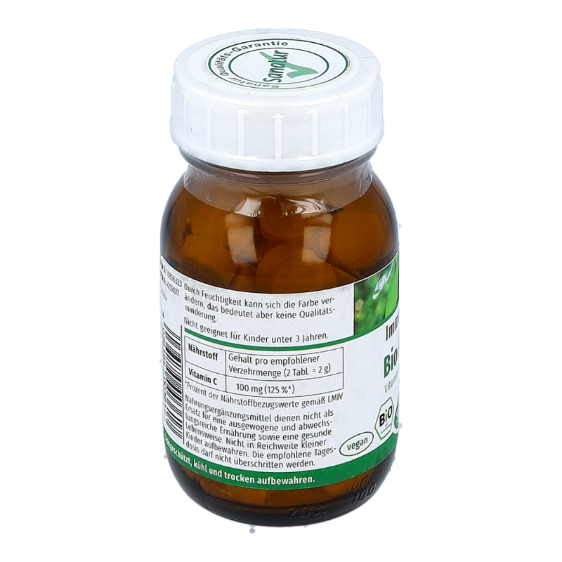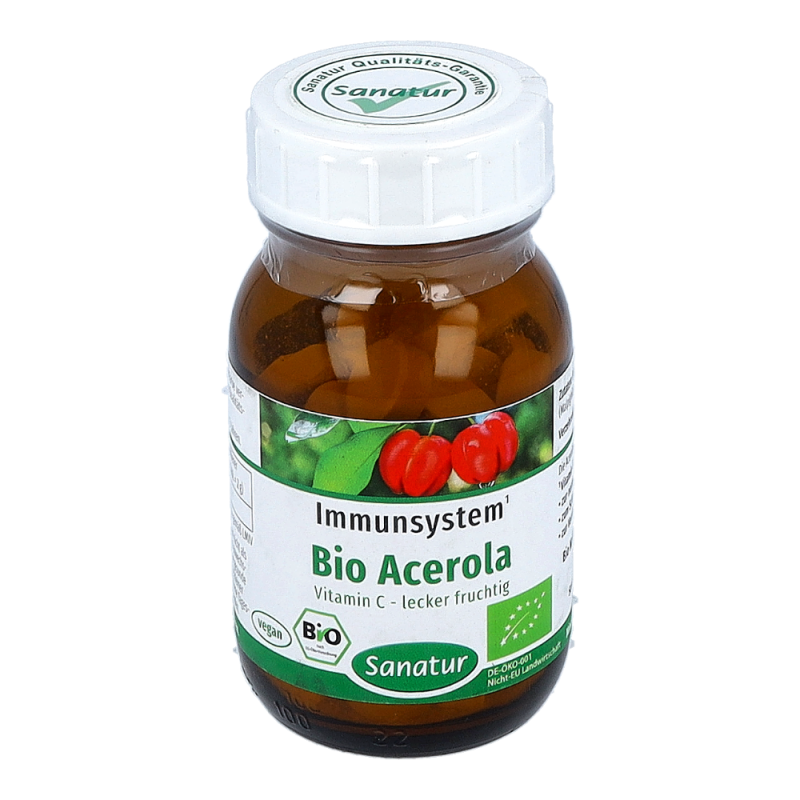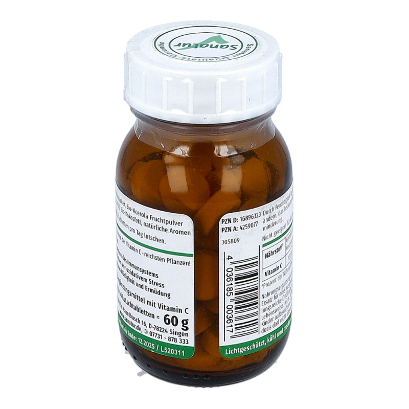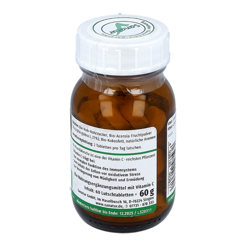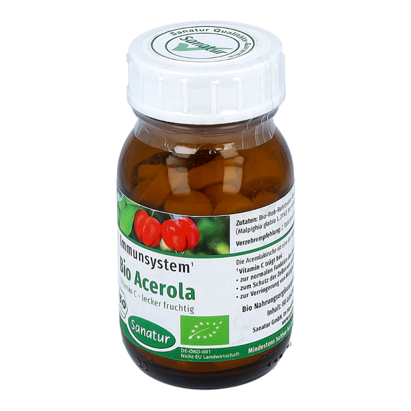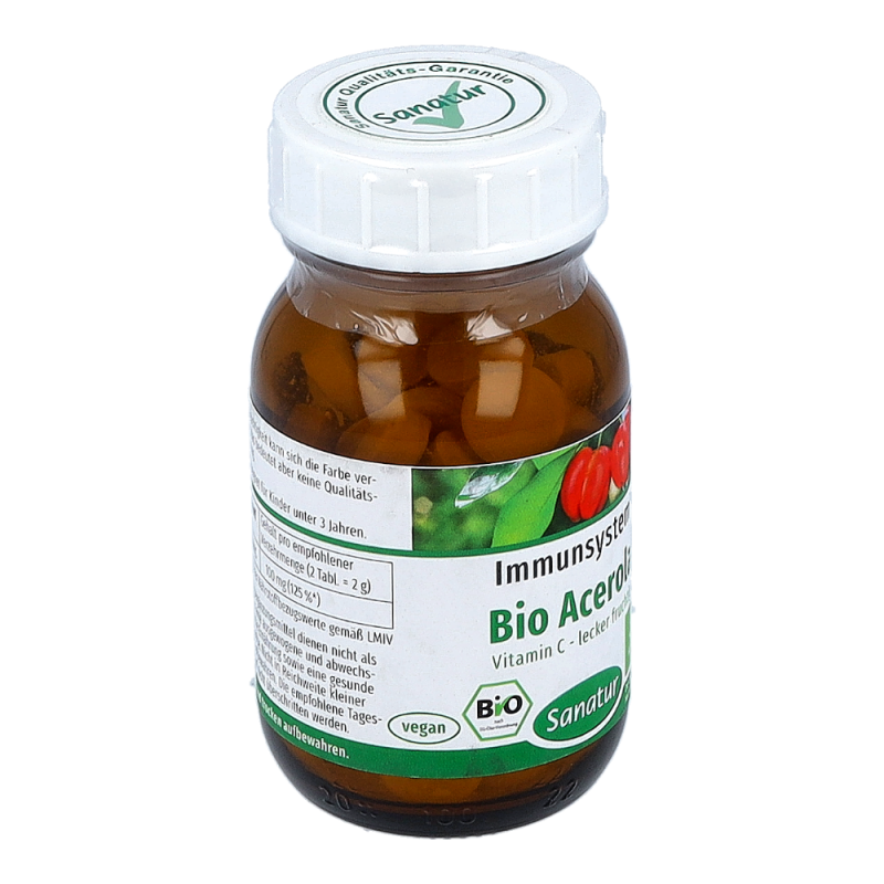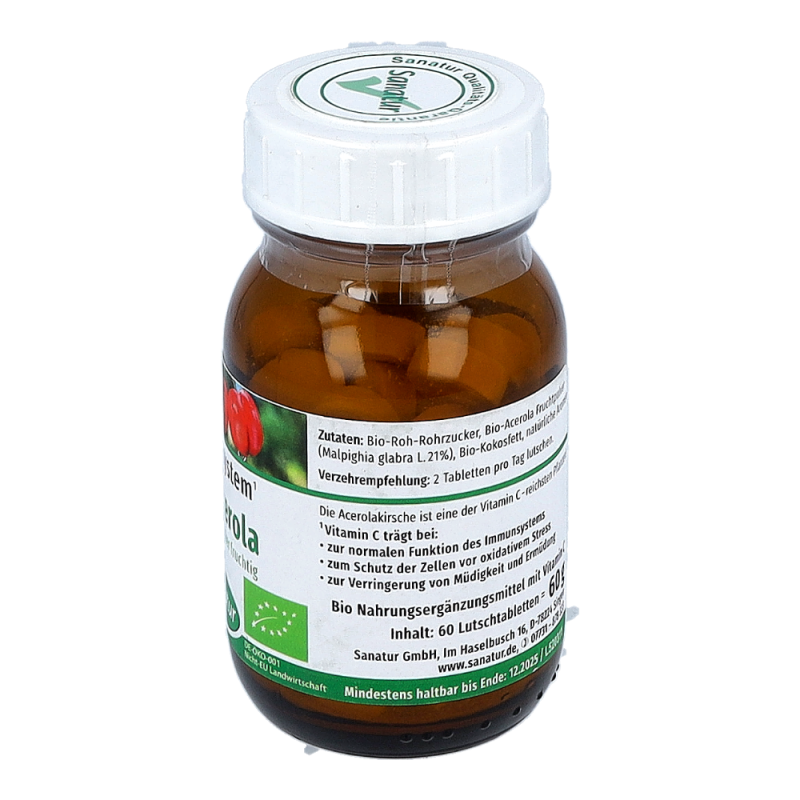 "Ohne Kristallzucker, mit Süßungsmittel Isomalt. Wohlschmeckende Lutschtabletten mit Acerolakirschen, den wohl Vitamin-C-reichsten Früchten aus der Natur. Zum täglichen Verzehr für die ganze Familie geeignet. Vitamin C trägt bei: zur normalen Funktion des Immunsystems zur Verringerung von Müdigkeit und Ermüdung zum Schutz der Zellen vor oxidativem Stress Das Besondere an Acerola: 100 % natürliches Vitamin C aus der Acerolakirsche natürliche Vitamin C-Quelle, wenn keine Zitrusfrüchte vertragen werden ohne Zusatz von synthetischem Vitamin C"
