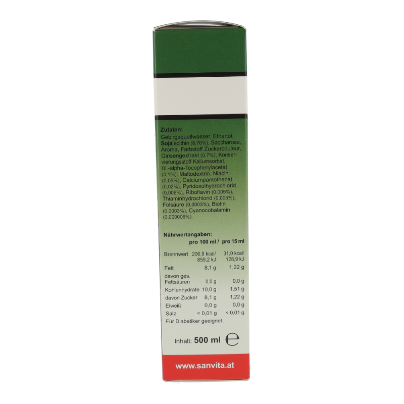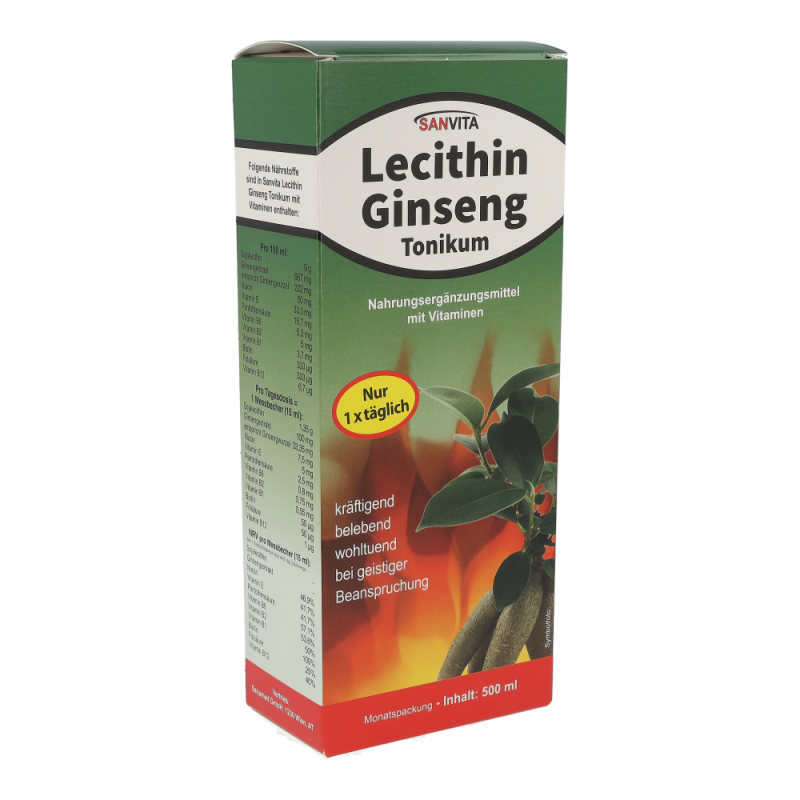 Sanvita Lecithin Ginseng Tonikum mit Vitaminen ist wohlschmeckend und enthält Lecithin, Ginsengextrakt, Vitamin E und Vitamine des B-Komplexes. Sanvita Lecithin Ginseng Tonikum mit Vitaminen wirkt kräftigend, belebend, wohltuend sowie unterstützend bei geistiger Beanspruchung.