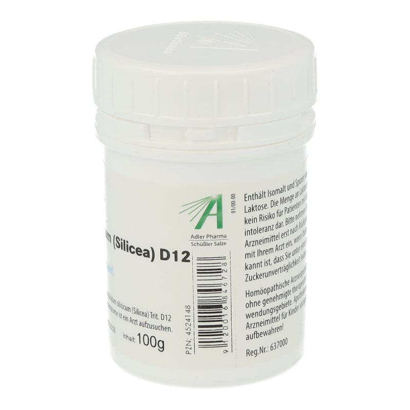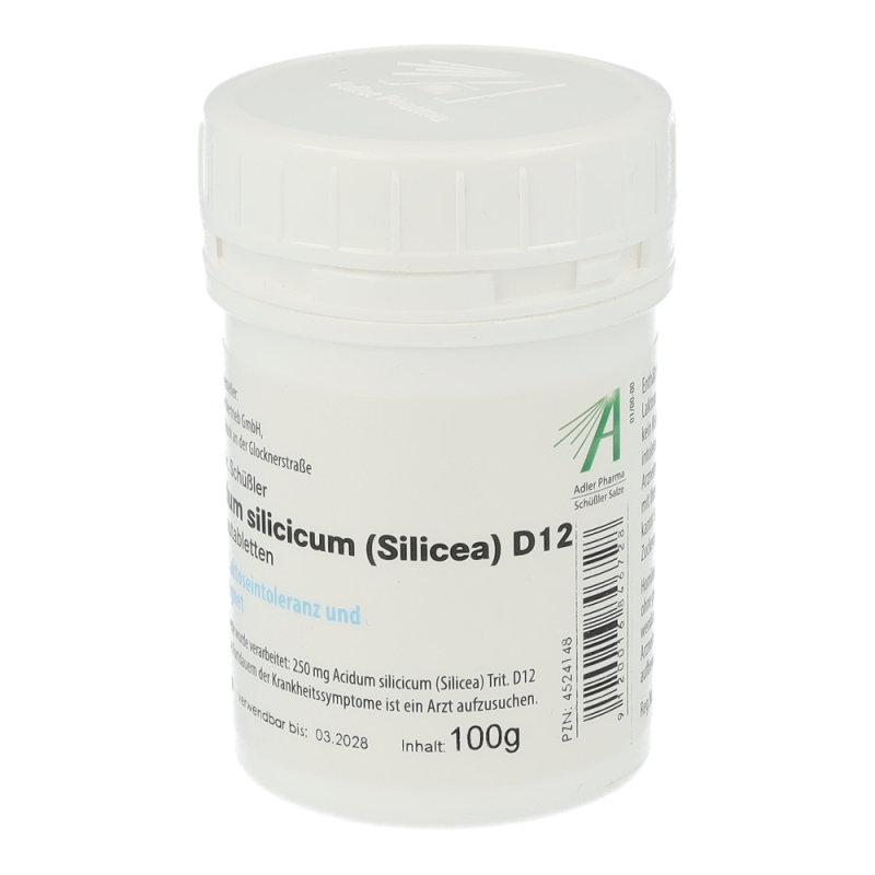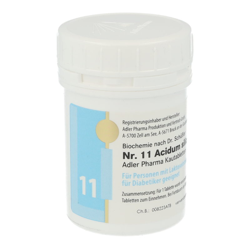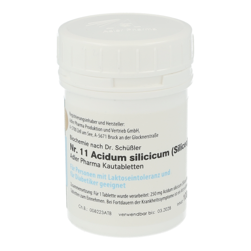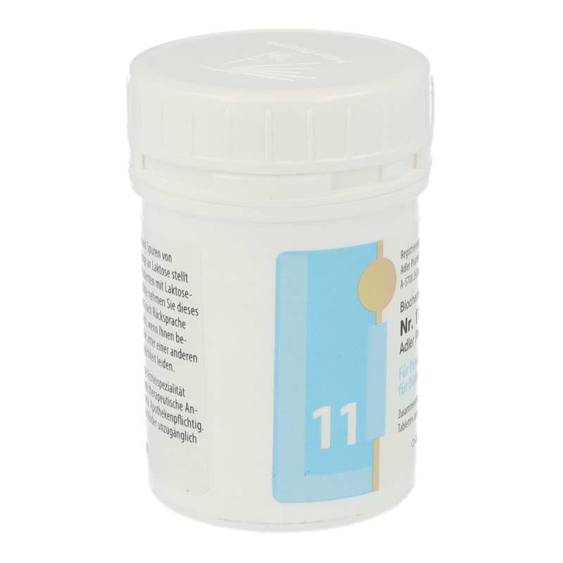 Schüßler Nr. 11 Silicea Adler 100 g D 12 Kautabletten werden auch als das Kosmetikum der Biochemie bezeichnet. Das Mittel steigert die Festigkeit des Bindegewebes und fördert den Aufbau von Haut, Haaren und Nägeln. Silizium ist als Bindegewebs- und Knorpelbestandteil für den Körper unentbehrlich.
