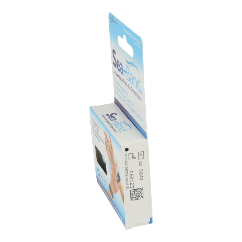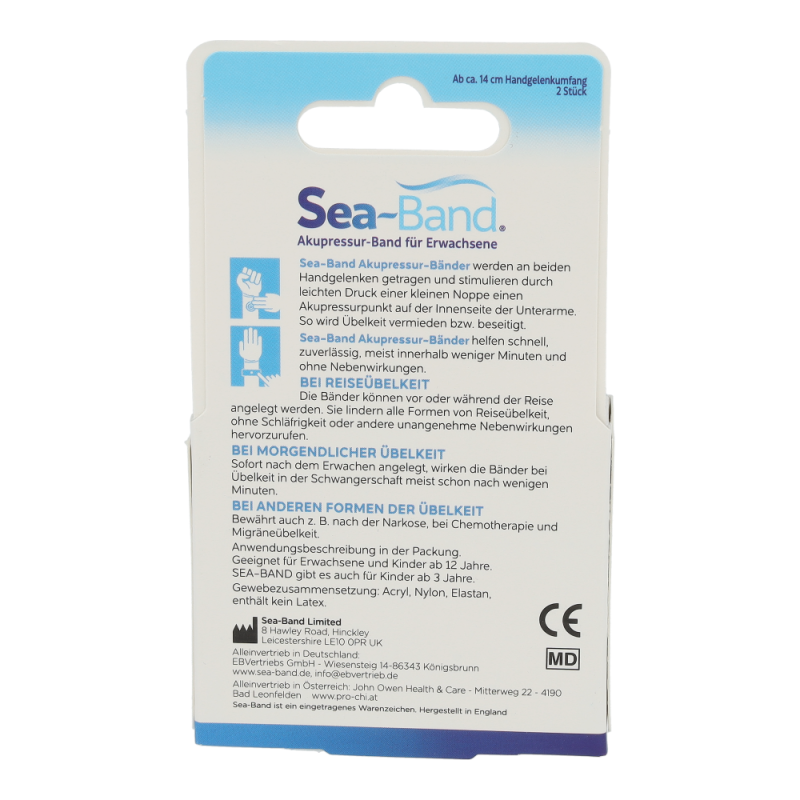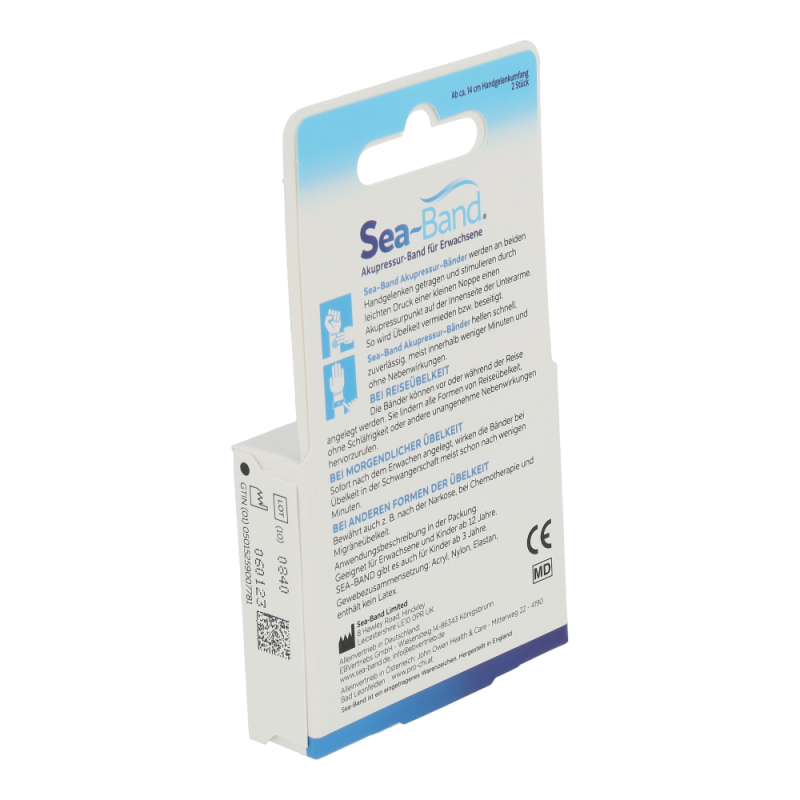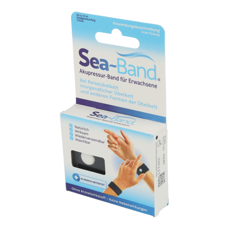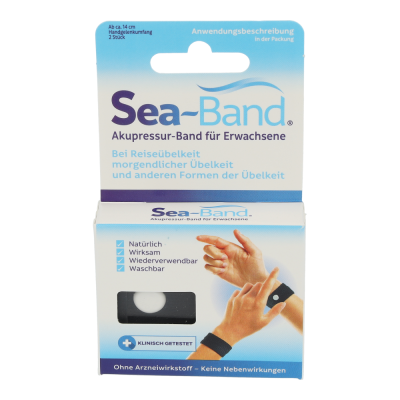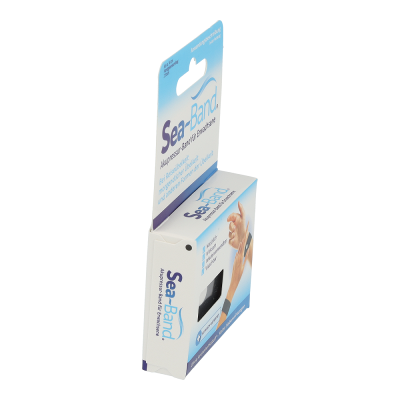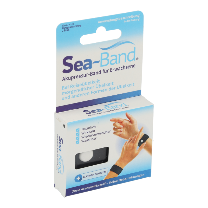 Eine einfache, wirksame und ausführlich klinisch getestete Alternative frei von chemischen Wirkstoffen, Magneten und Nebenwirkungen, bietet das Akupressurprodukt SEA-BAND. Laut der traditionellen Chinesischen Medizin fließt Lebensenergie Qi (chi) durch Energiebahnen (Meridiane), die die inneren Organe mit der Oberfläche des Körpers verbinden. Wenn dieser Fluss blockiert oder gestört wird, fehlt das Gleichgewicht zwischen den zwei komplementären Energieformen Yin und Yang. Beschwerden oder Krankheit sind die Folgen. 4000 Jahre Praxis stellte fest, dass leichter Druck (Akupressur) auf den Nei-Kuan Punkt, zwischen den Beugersehnen am Handgelenk, eine stark harmonisierende Wirkung bei Übelkeit und Erbrechen verursacht. Das dehnbare SEA-BAND ist mit einem runden Kunststoff Knopf ausgestattet, der direkt über dem Nei-Kuan Punkt an BEIDEN HANDGELENKEN positioniert wird. Die spezielle Zusammensetzung des Bandgewebes (Acryl, Nylon und Lycra, ohne Latex) sichert einen optimalen, therapeutischen Druck und sorgt für besten Tragekomfort und Wirksamkeit. In rund 30 kontrollierten klinischen Studien an Tausenden von Patie rigoros getestet, anerkannt von der FDA, werden mehr al Millionen SEA-BAND weltweit jährlich verkauft.